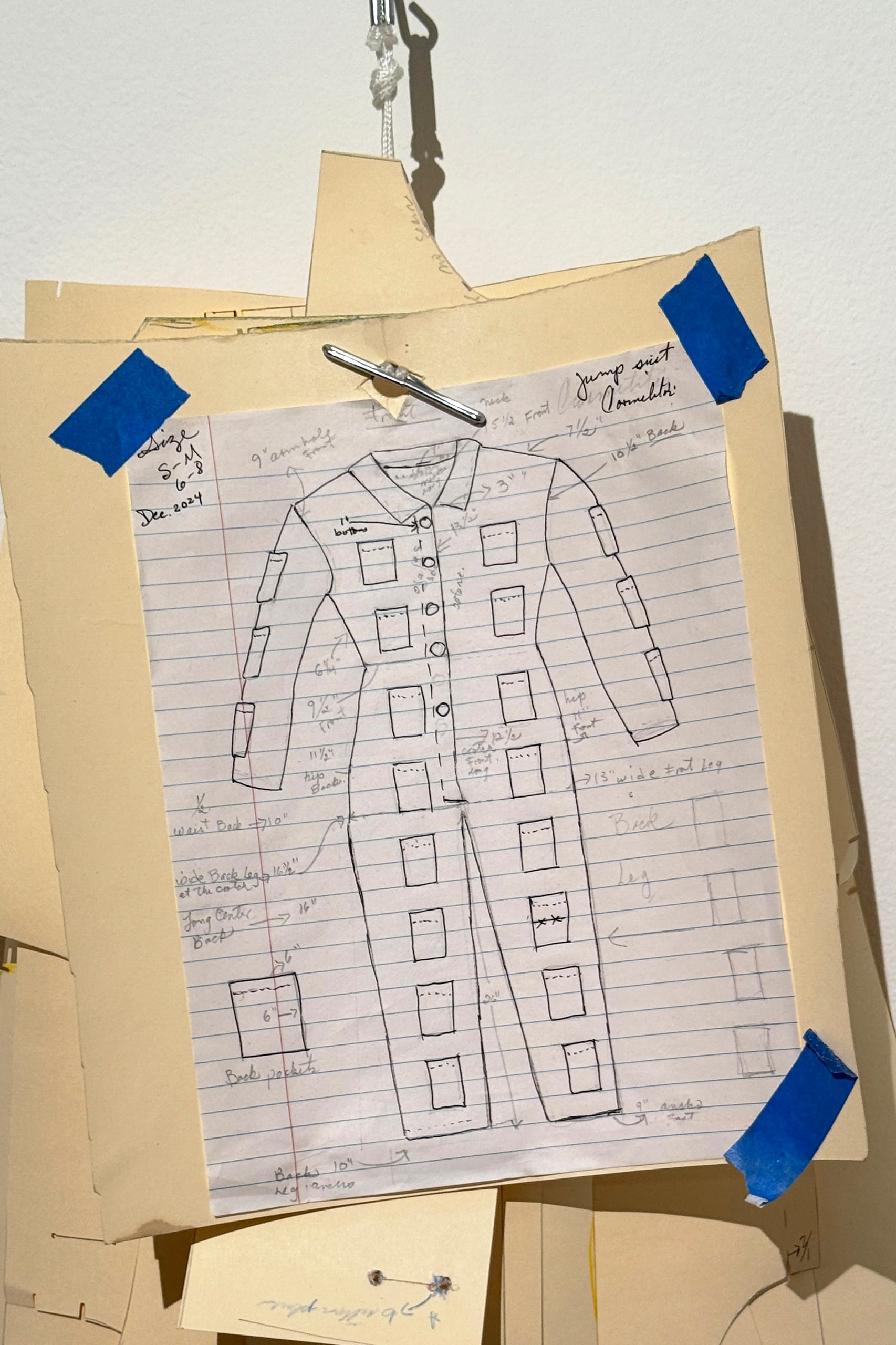 Alongside the clothing, the gallery showcases the jumpsuit pattern that spawned the others, and cutting tables filled with Carmen Vargas’s sewing supplies and knickknacks. The installation “partially finished garment: top” (2025), which showcases a jumpsuit’s striped fabric cut lined up against the pattern’s collar segments, appears freshly touched, as if Argote and her mother simply stepped away to take a break during their sewing frenzy.