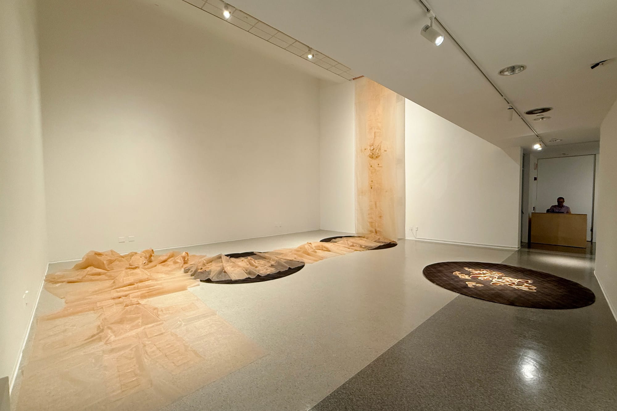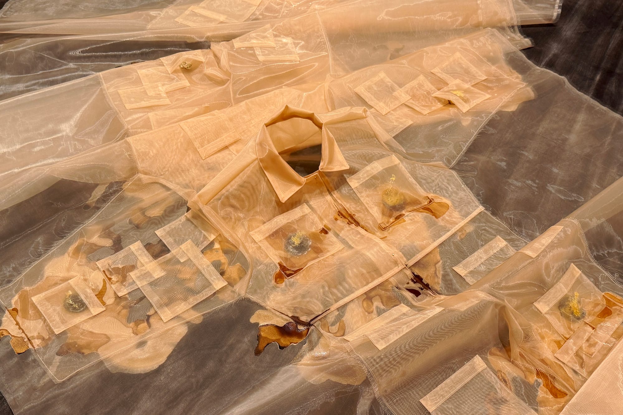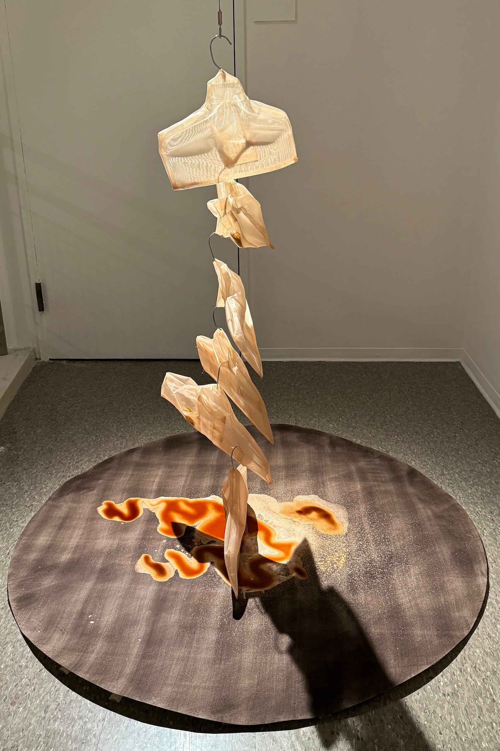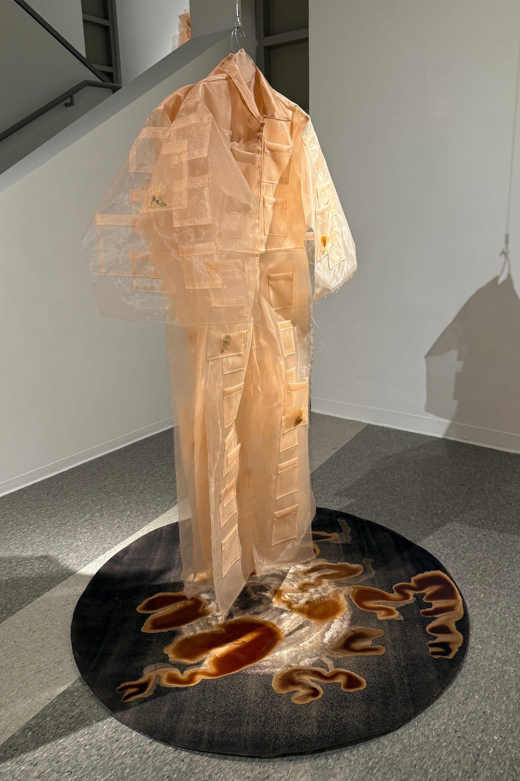This eerie work is the basis for the show’s other half, located across campus in the Nichols Gallery. In this room, Argote focuses more broadly on the jumpsuit’s role as a working class uniform. “Gajes del oficio” (2025) unfolds from the ceiling like a scroll. An abstracted variation of this outfit, now made from a semi-sheer peach polyester organza, marches in a massive daisy chain across the gallery floor. Argote has tucked lemons into some of the pockets, which she harvested from Pitzer’s campus and farms around the Inland Empire. As the fruit decomposes, it leaks its acidic juice onto a hand-dyed paper placed underneath the jumpsuits. A chemical reaction causes the dye to change color, matching the pink fabric.