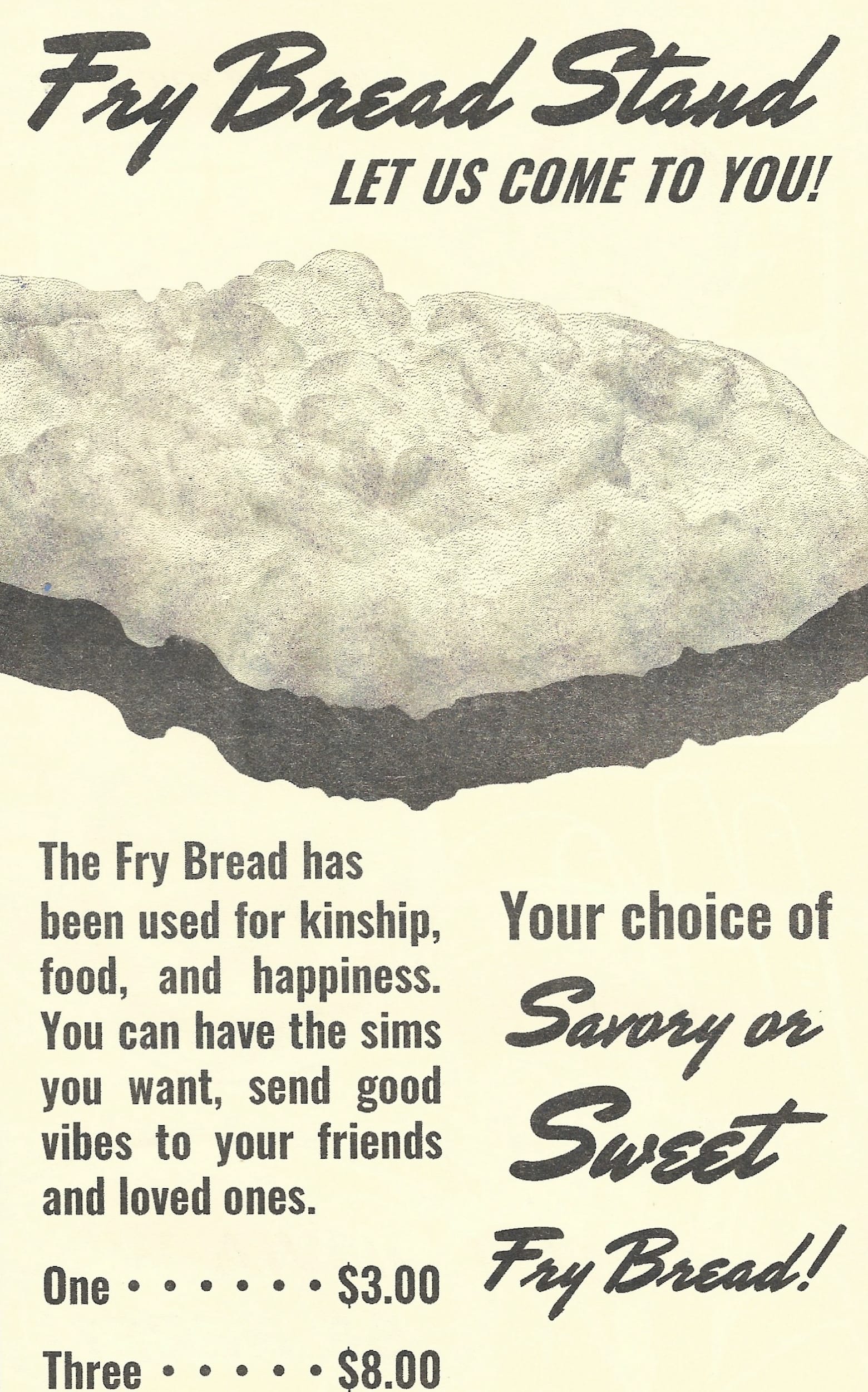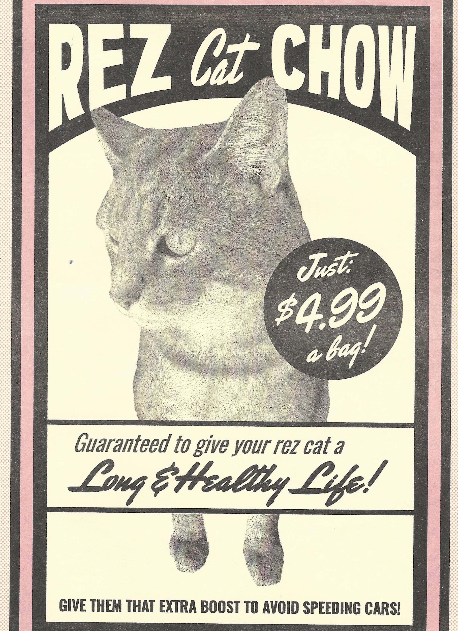 The chapters within Rezbians are bookended by Selam’s tributes to subsistence and pleasure via advertisements for the fictitious Fry Bread Stand, Rez Cat Chow, and Kúpi, an Ichishkíin word for coffee. Her reworking of extant advertisement styles was informed by the role that commodity foods have played on the reservation in caring for both oneself and one’s elders.