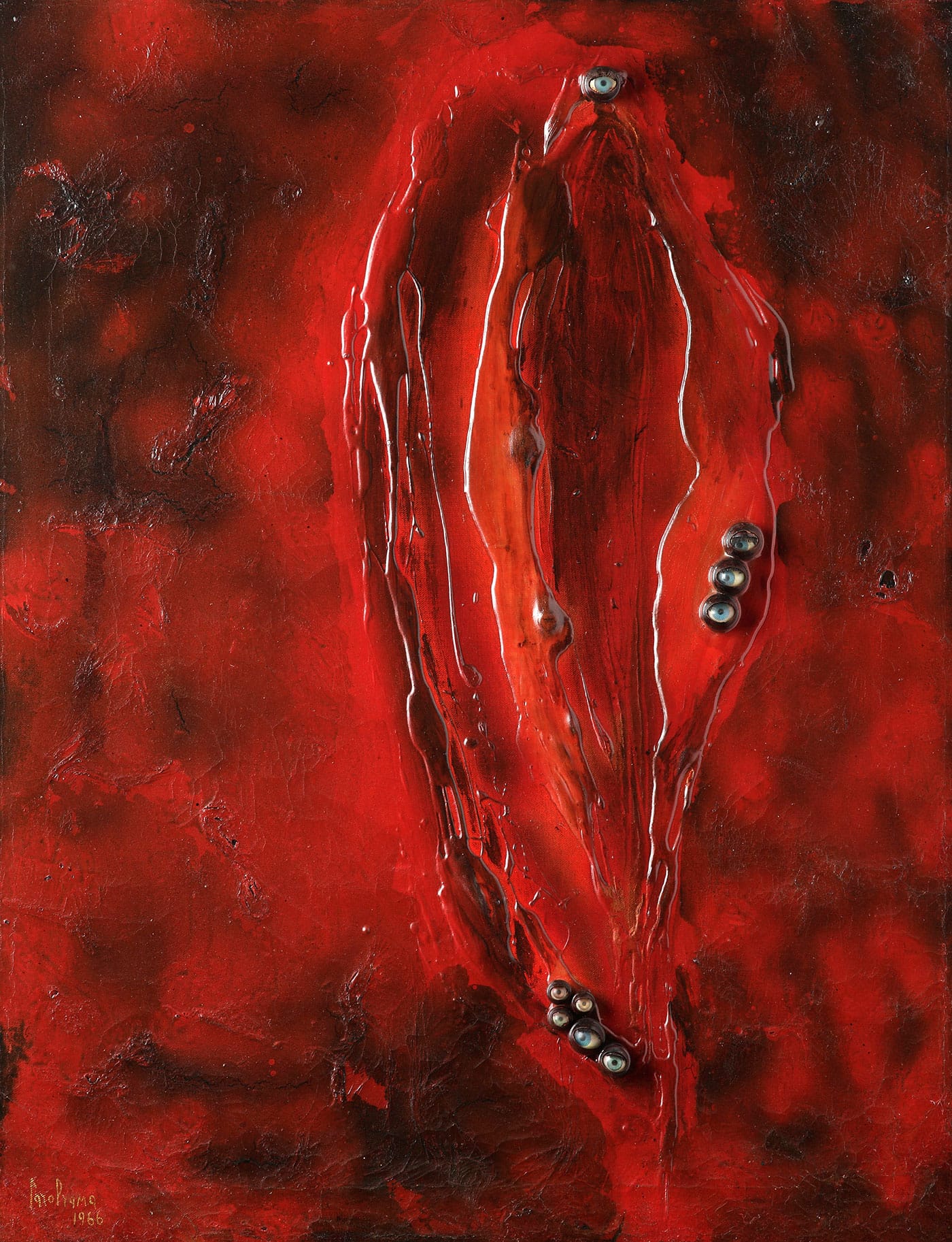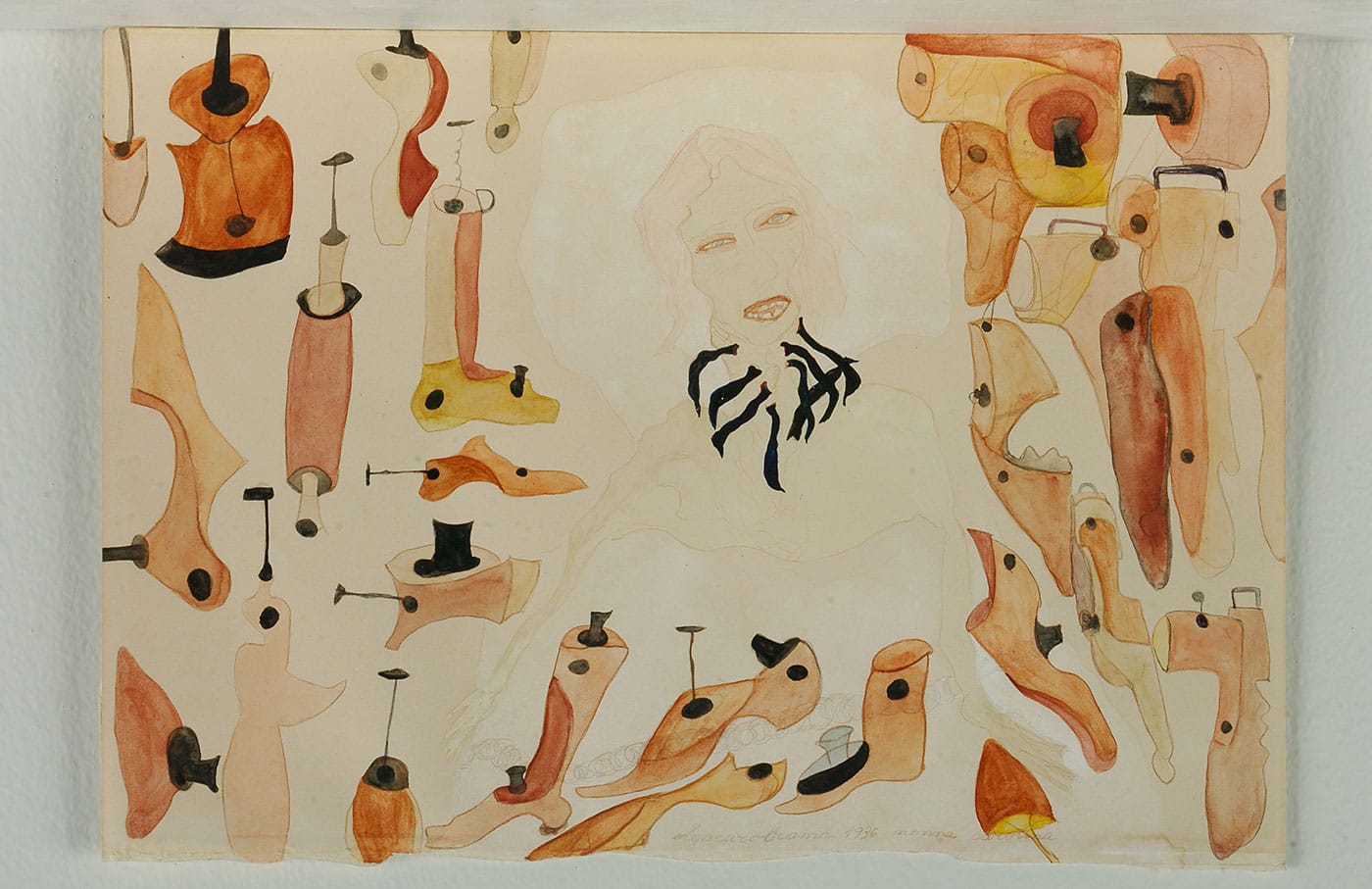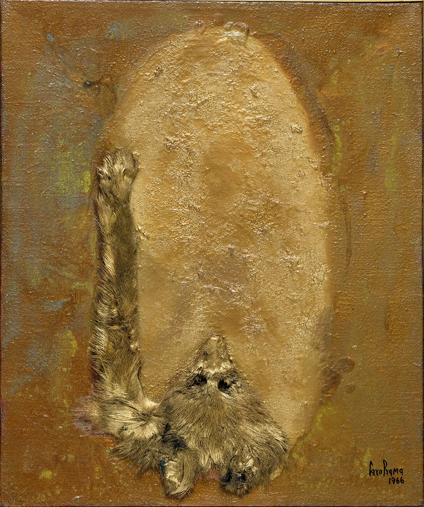 Such versatility manifests even within individual works. For example, on first glance, the watercolor “Nonna Carolina” (Granny Carolina, 1936) appears, due its soft hues and the light touch of the medium, pleasing to the eye, almost like a scene from a children’s book or fairy tale. But upon closer inspection, the canvas is strewn with what appear to be amputated body parts or prosthetics. In the center, so pale it’s difficult to make out entirely, is a ghostly apparition of a woman’s torso, her face frozen in a grimace. Are the many limbs hers? Is the female figure a carcass? Is the scene culled from memory, a dream, or neither? The work’s pale hues and subject matter cancel one another out, and in doing so, they resist simple interpretations. In a broader sense, Rama’s watercolors counter her paintings of nude bodies, of amputated penises and vaginas, as well as her assemblages. In the last group, her piece “Le tagliole” (The Traps, 1966) is a stunning construction of the hide of a fox coated in gold enamel. The shining orb suggests a sun, or an amorphous cell, with the face and arm of the dead animal centered in a sea of browns, golds, and reds.