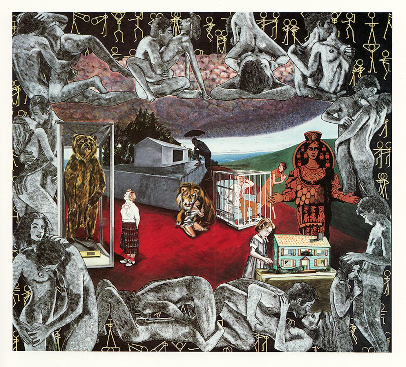 In her tightly composed canvases, Caroompas incorporated a mix of high and low visual culture to explore gender roles and power dynamics. She drew from art history, novels such as Frankenstein and Wuthering Heights, movies, rock music, magazines, and advertisements to both reflect and subvert the way images construct identities and reinforce systems of dominance.