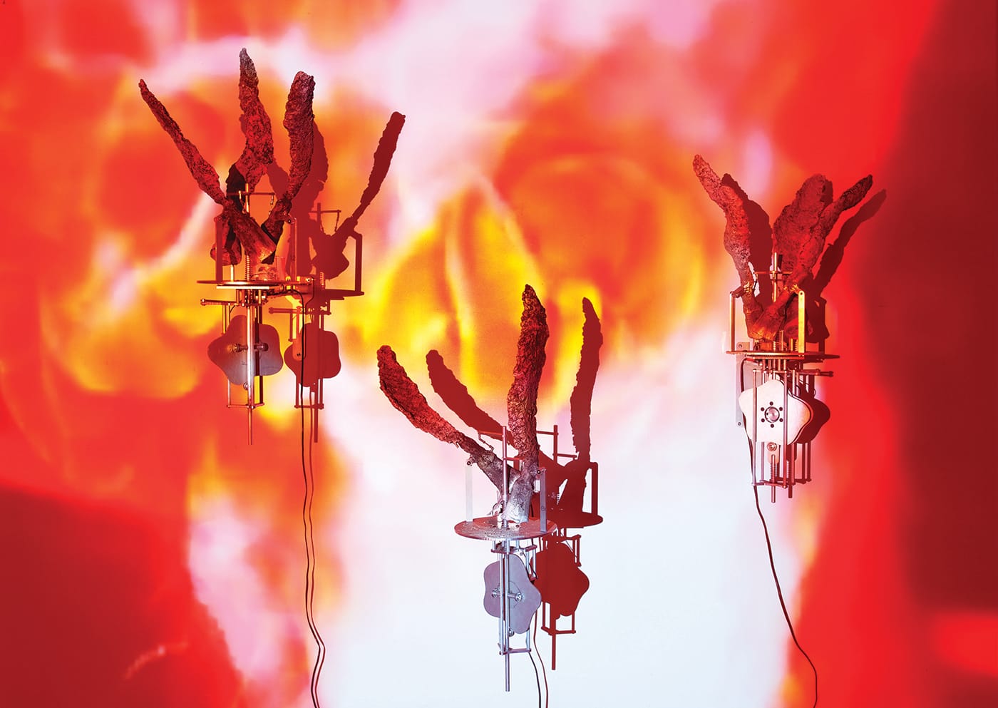 JB: Flange 6 rpm (2013), recalls much of your early abstract imagery, yet it addresses your sensual ambiguity — the way in which a projection of raging fire envelops a sculptural series of motorized, poured metal flanges. There’s visceral tension in their gyrating movements toward and away from one another. How did this work come about?