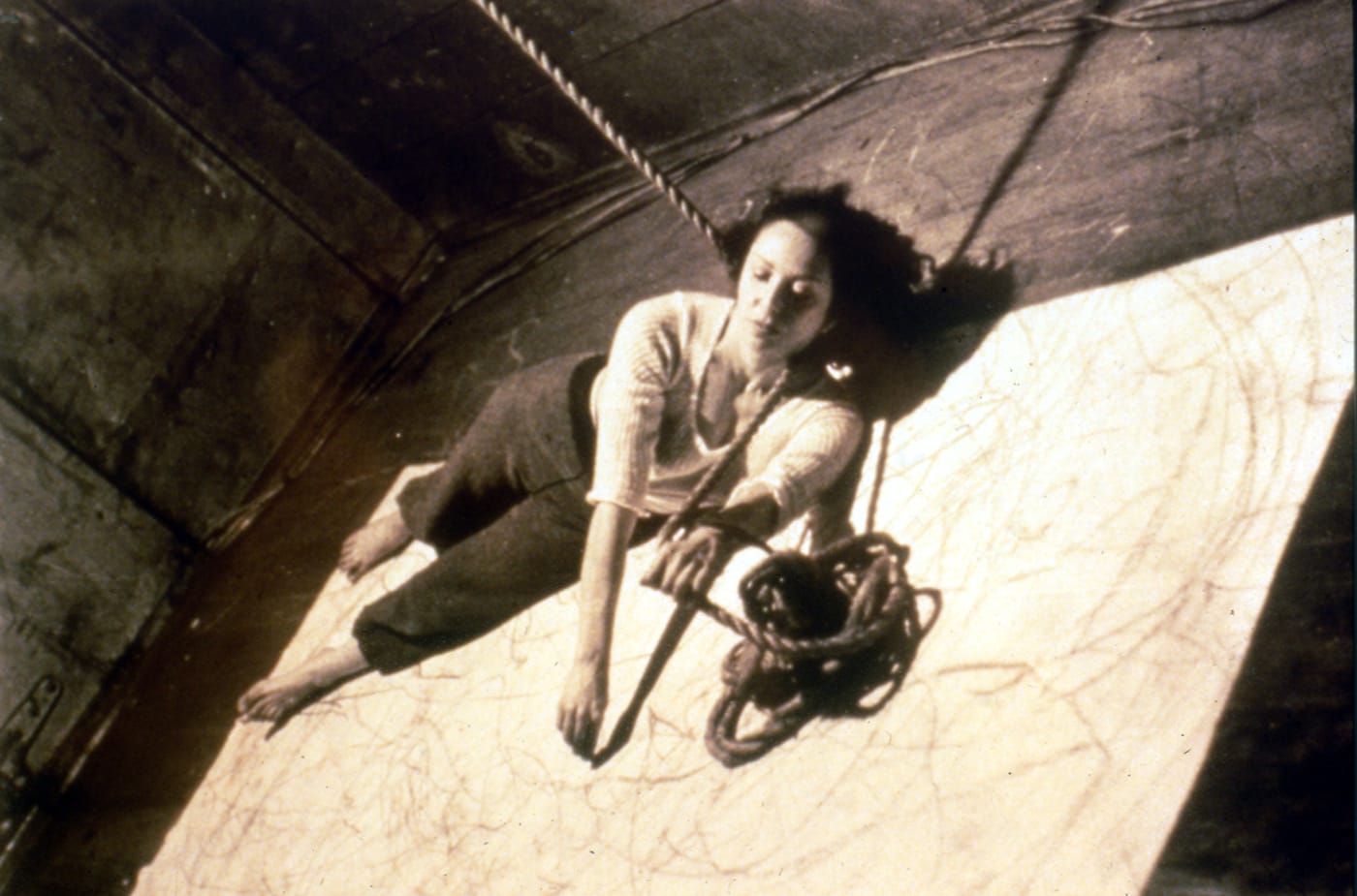 CS: That was my sensation of swinging in a harness in Up to and Including Her Limits (1973-76) [a performance in which Schneemann, suspended in a harness on a three-quarter inch manila rope, sustains an entranced period of drawing. Her extended arm holds crayons that stroke the surrounding walls, accumulating a web of colored marks]. I recognized that the suspension would lead me to another aspect of drawing that I could sustain over a long period of time. It’s an ecstatic feeling, but it takes abdominal strength to keep moving and not spill out of the harness. The work relates to a child’s pleasurable feeling in a swing, but it also addresses Pollock’s extended stroke.