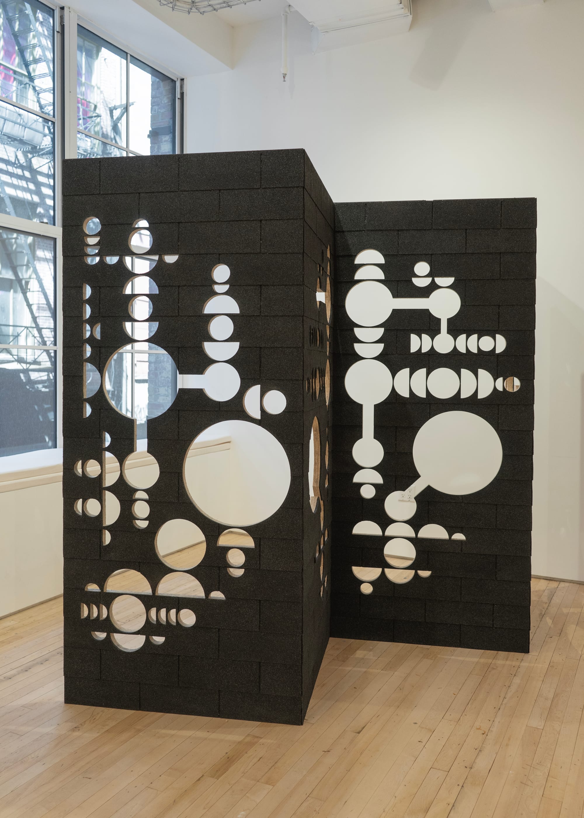 In Monnet’s sculptural projects, she creates aggregated works that combine visual legacies and vocabularies from her Anishinaabe and French heritages, popular culture, and the simple reductivity of Modernist abstraction. In her 2023 solo exhibition HOLDING UP THE SKY, at the Art Gallery of Burlington in Ontario, she employs motifs of Indigenous storytelling technologies like birchbark biting, a technique in which thin sheets of the bark are folded and pinched into patterns using one’s teeth. Monnet creates interpretations of these ancestral designs, which are often found on basketry, beadwork, and regalia, through a computer program. “I make them on the computer so I never make the same design twice — it becomes a language that evolves over time just as a [spoken] language would evolve, or society evolves.”