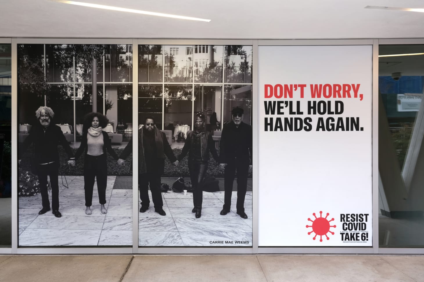 Resist Covid / Take 6! pairs text with iconic photographs by Weems to underscore the importance of preventive measures, dispel myths about the virus, and thank essential workers.