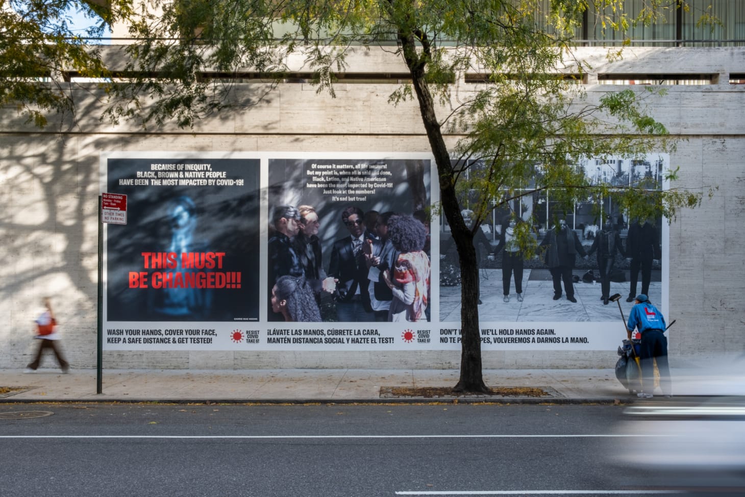 With a new, sprawling public art installation opening today at Lincoln Center in New York City, the American artist Carrie Mae Weems wants to help educate BIPOC communities on the impact of the pandemic — and share the facts to prevent its spread. Titled Resist Covid / Take 6!, a reference to the six feet of social distancing recommended by health authorities, the outdoor exhibition includes banners facing Broadway Avenue as well as a 40-feet installation on Amsterdam Avenue with messages in English and Spanish.