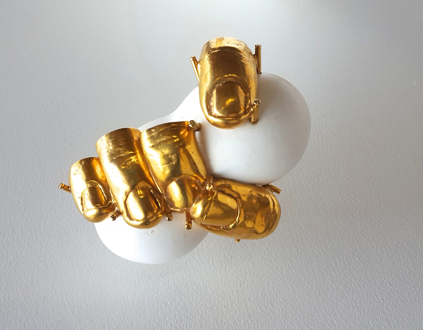 While Kalman’s molding methods may be bootlegged, the resulting objects are extremely elegant and refined, with details that reveal Kalman’s undergraduate roots in jewelry-making. The large, ovoid vessels are smooth, slip-cast, or hand-built ceramic, punctuated by golden accents and offshoots — actually gold-plated copper that Kalman transfers to wax molds via electroforming. Some of the pieces are quite figurative, easily identified as molded off Kalman’s palate, or the space between her fingers in a loosely clenched fist. Others are highly abstract and only identifiable as interactions with Kalman’s body in the context of photographs that hang on the gallery’s walls, surrounding the vessels and forms atop pedestals.