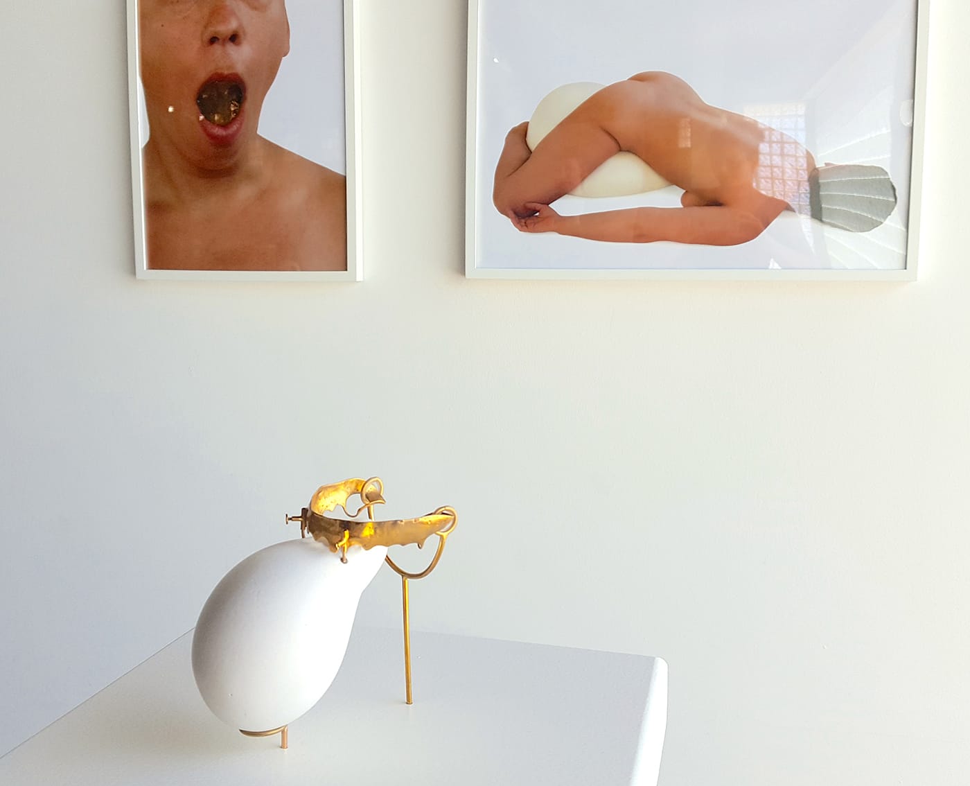 Kalman has managed to achieve a tricky balance, creating beautiful objects with no attention spared to detail, through a process that evokes horror and alienation. In this way, DEVICES FOR FILLING A VOID is a an object lesson in contemporary womanhood, largely characterized by a struggle for ownership and agency within a body that patriarchy feels entitled to judge, alter, and violate. In a photograph that greets visitors on the entry wall of the gallery, Kalman is nude and pictured from the waist up, holding a medium-sized white ovoid topped by a gold nipple. There is an unmistakable visual lexicon of motherhood in the way she holds the object, and in the literal act of sucking the nipple of the device — but, of course, the role is reversed, disrupting the tableau.