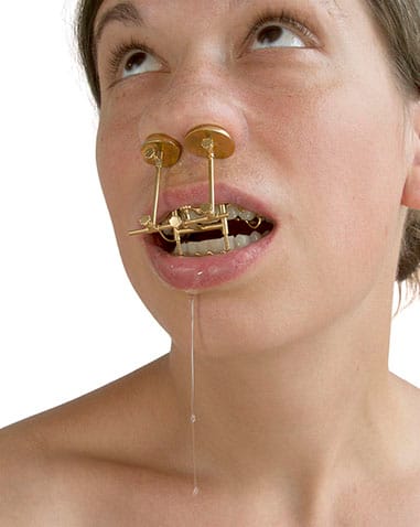 Kalman’s inspiration for some of her fantastical objects came from real-world medical devices designed to train, straighten, or augment the body for the purpose of healing deformations or attempting cosmetic improvements. A kind of headgear-from-hell, based on a device designed to hold the soft tissue in place while healing from a broken nose, has been extended to include the relief-cast of Kalman’s nasal passages. In the picture where Kalman has reincorporated the object, her eyes roll in crucifixion-style anguish while a long thread of drool streams over her bottom lip from her clamped teeth.