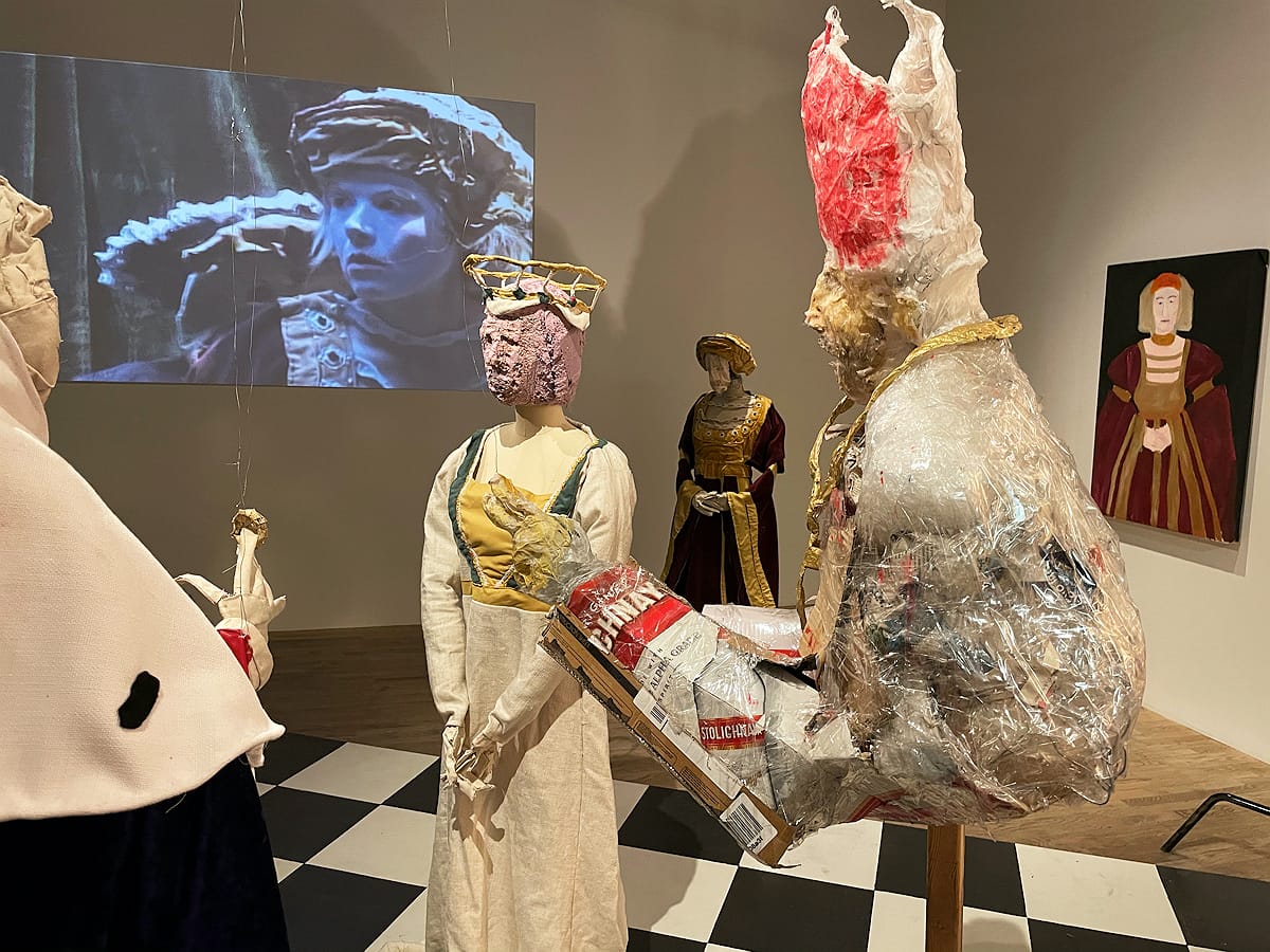 Giordano’s immersive tableau-cum-visual wormhole hurls the viewer headfirst into this historic clusterfuck, chronicling a tale of duplicity: the inconsistent portrait, the wedding initially conducted by proxy, and the "surprise" first meeting in which Henry donned a disguise. Navigating cartoonish faux stained glass and banquet tables of spray foam meat, visitors encounter a cast of courtesans crudely fabricated from materials such as wire, duct tape, and cling wrap. Giordano confounds gender and power dynamics by playing both Anne of Cleves and a drag king Henry in short, soapy scenes projected on the walls. Slippages and doublings abound, as characters and props in the gallery space — Anne Boleyn, a leg of ham — materialize onscreen.