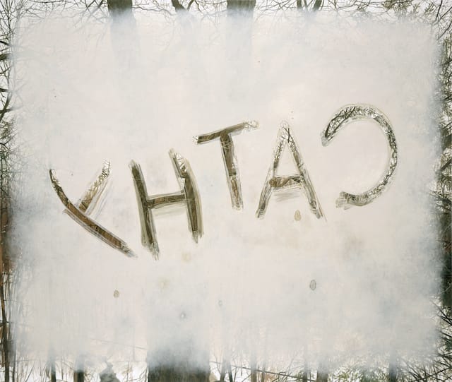 In the painting, “Cathy” (2001), Murphy depicts an ice-covered window in which someone named Cathy, presumably the artist, has written her name in large letters on the thin layer of frost clinging to the windowpane’s outside surface. Because we read the letters backwards, it is as if “Cathy” had been standing outside on the snow-covered ground when she wrote her name in big letters across the window. In contrast to a painting’s so-called permanence, the scratched signature is short-term. The season will change and the ice will melt and the window will become transparent again.