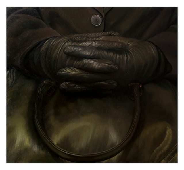 The gloves take up a large part of the painting. They, along with the coat’s single visible button and leather purse are focal points in this black painting which, if you look closely, is full of other colors, such as green, red and brown. Although we are apt to conclude from the plain, functional clothing she is wearing that she is somewhere between her early fifties and late-sixties, the deeply creased leather gloves can also be seen as harbingers of her future, the border she is about to cross. Aren’t the leather gloves pieces of cured, dead skin? Isn’t the woman whose face we never see and, in effect, is invisible to us, wearing pieces of dead skin that fit her hands perfectly, like a second skin? Don’t the gloves evoke that threshold moment when the individual, who in this case is invisible, regarded as secondary and therefore forgettable, passes from the living to the dead? And to take this line of thought one step further — might not her hands be similarly clasped when she is placed in her coffin? Or, if we look at “Clasped” from another perspective, might not this somberly dressed woman be on her way to a funeral of one of her invisible friends?