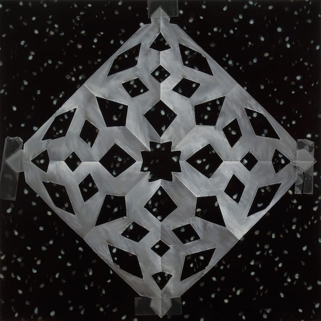 “Snowflakes (For Joyce Robins)” measures 52 x 52 inches, a perfect square. The scale of the painting underscores that it is a fiction based on direct observation. Here, it seems to me, is proof of what Murphy has never said about herself, which is that she is an observational painter with a philosophical outlook, who understands that abstraction and representation have become interchangeable, and to make work that focuses on their supposed difference is to avert one’s eyes. Her paintings are prolonged meditations on mortality. Her cut-paper snowflake is an enlarged version of a familiar decoration that we made as children and have seen as adults, particularly on the windows of elementary schools. We are also likely to remember that, as children, we learned that no two snowflakes are alike, and that our cut-paper versions were proof of both the snowflakes’ individuality and our own: no two of the snowflakes were ever exactly alike either.