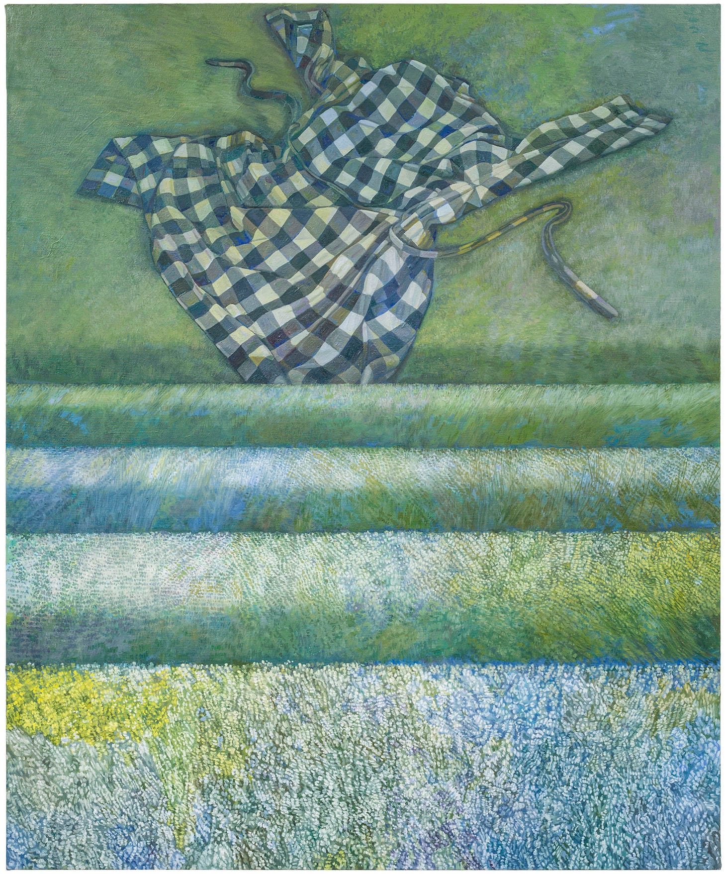 In “Flight,” we are positioned at the top of a flight of carpeted stairs looking down at a belted, checkerboard bathrobe lying at the bottom. Compositionally, the stairs start at the painting’s bottom edge, rising more than halfway up the surface, with the bathrobe just fitting in the remaining space along the top. Everything is carefully calibrated, but none of it seems contrived.