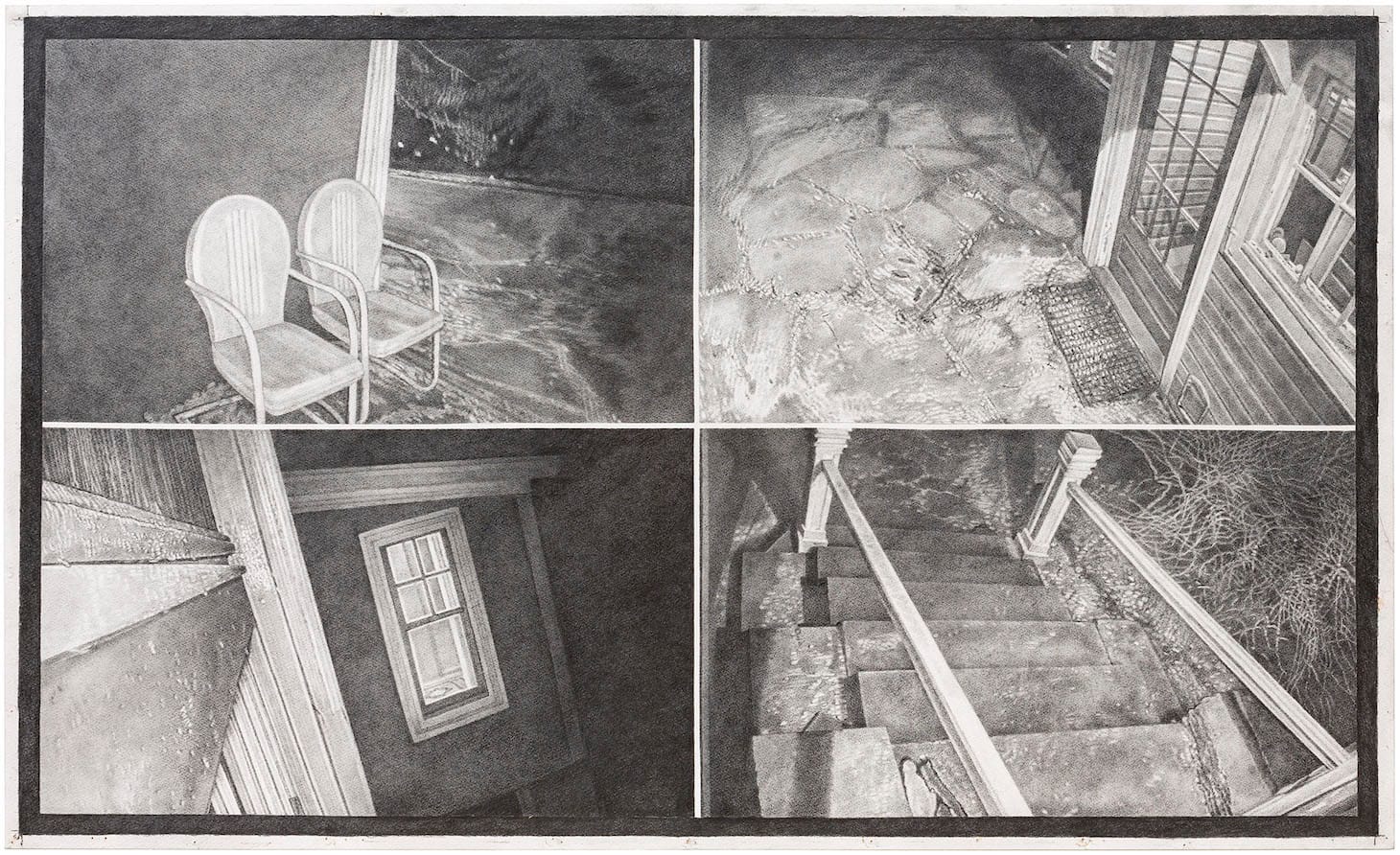 The angle of the composition and the cropping are essential components of her inquiry, with each painting giving us a different view of a specific thing, the frontal one of the patterned back of a camouflage jacket in “Camo” (2020) or the four angled views shown by a surveillance camera in the tour de force graphite drawing “Night Watch” (2018), which replicates that eerie, otherworldly light of a camera filming the perimeter of a house at night.