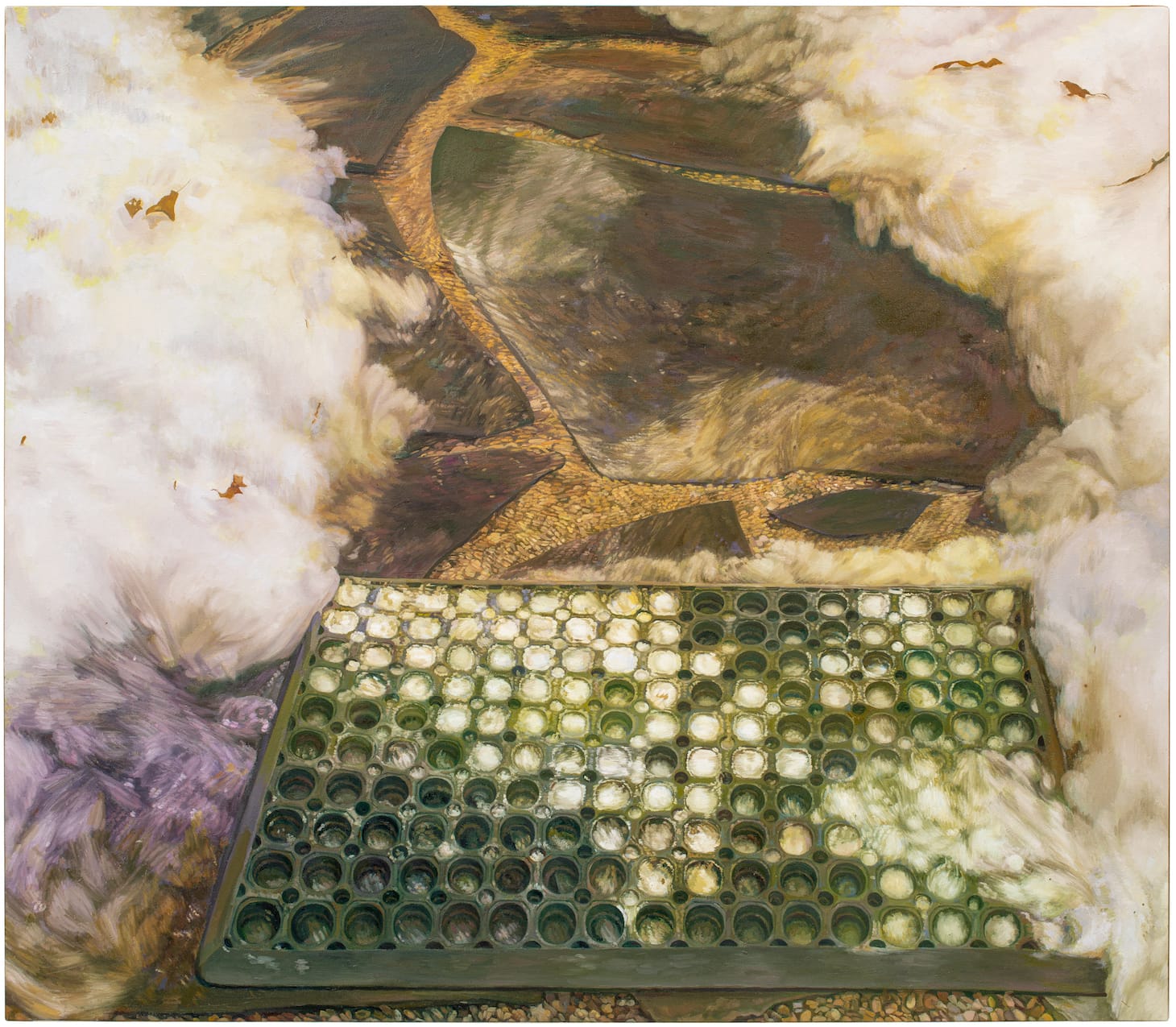 Murphy depicts the doormat as a trapezoid rising from the painting’s bottom edge and tilting forward. The angle of the tilt and the close-up view suggest the viewer is standing inside, about to go out. The doormat’s angled plane seems to be foretelling the future, as well as underscoring the anxiety one might have about falling, especially if you feel frail or vulnerable. It is this state of our physical being that Murphy speaks to. By picking a subject that is literally underfoot, and being attentive to it, and to the piled snow and stone pathway, she shatters the illusion of security that many people believe will never change. Her sensitivity to aging and the feeling of defenselessness that can flood any one of us is unique and original, especially in the current art world and its worship of signature styles, which can be seen as a misguided bulwark against time passing. The art world should do the right thing and honor Murphy’s greatness.