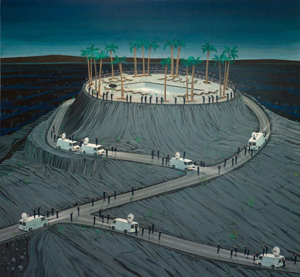 Whereas Opie captures photos of athletic garb on teenagers, Ian Davis paints the suits of grown men. In “Wee Small Hours” from 2012, men in indistinguishable black suits storm a pool on a hill like a swarm of ants. The jagged lines of the cliffs dominate most of the composition with the dusk sky and swaying palm tree competing for attention. Like Opie, his composition minimizes the faces and the individuality they might convey.