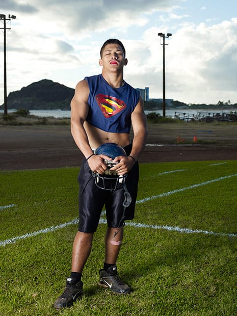 Although the boys appear as a strong team in the wide-angle photographs on the playing field, Opie’s close up portraits accentuate their awkwardness. The boys strain to look tough but their tense body language and quizzical facial expressions ruin the attempt at machismo. For example, In “David, Austin and Bryan” (2009), each boy betrays a certain sense of unease in the way he poses and doesn’t smile for the camera. Perhaps, the uniforms are just uncomfortable. But it’s hard not to read into this mixture of smugness and fragility the conflicting currents of adolescence. Twisted feelings that membership in a strong team can assuage.