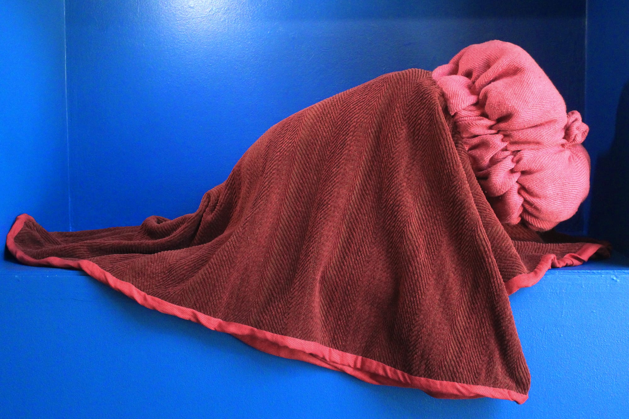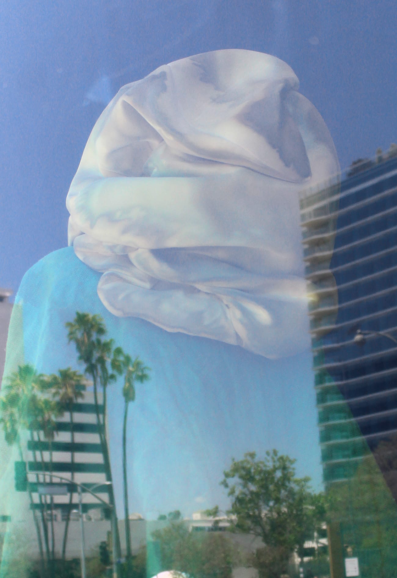 By introducing the illusion of fluids — created from acrylic, dye, wax, and wood — Cooper makes her beautiful sculptures grotesque. In Craft Contemporary’s built-in niches, she presents four smaller figures, which are more abstract than those on the main stage, but still read as living creatures. The way their fabric is draped puts them into vulnerable positions, states of agony and despair. “Bloodsport” (2020) has red netting protruding from its center, a fatal wound. “Leatherhead” (2020) sweats from the head and twists its body, experiencing pleasure from pain.
