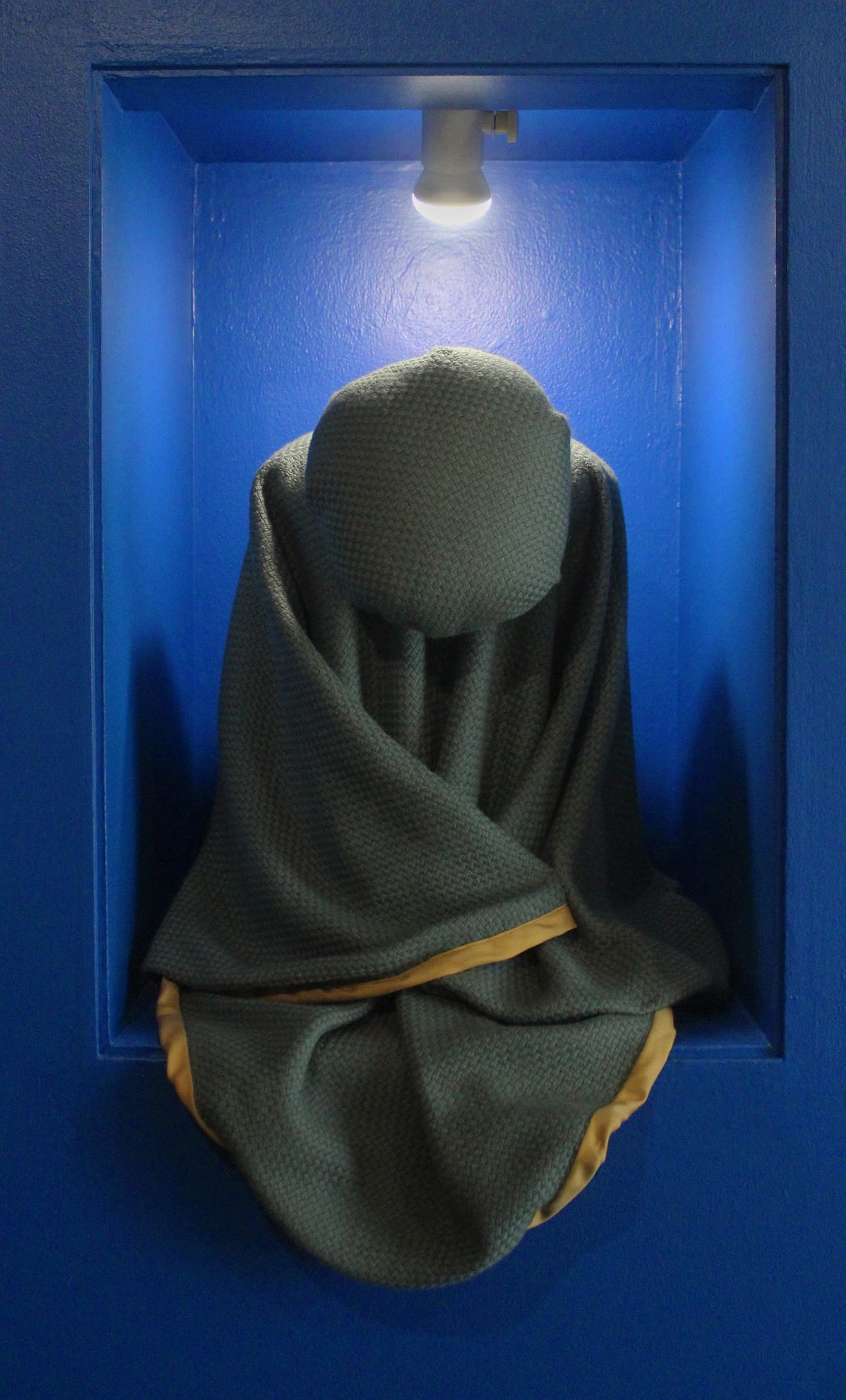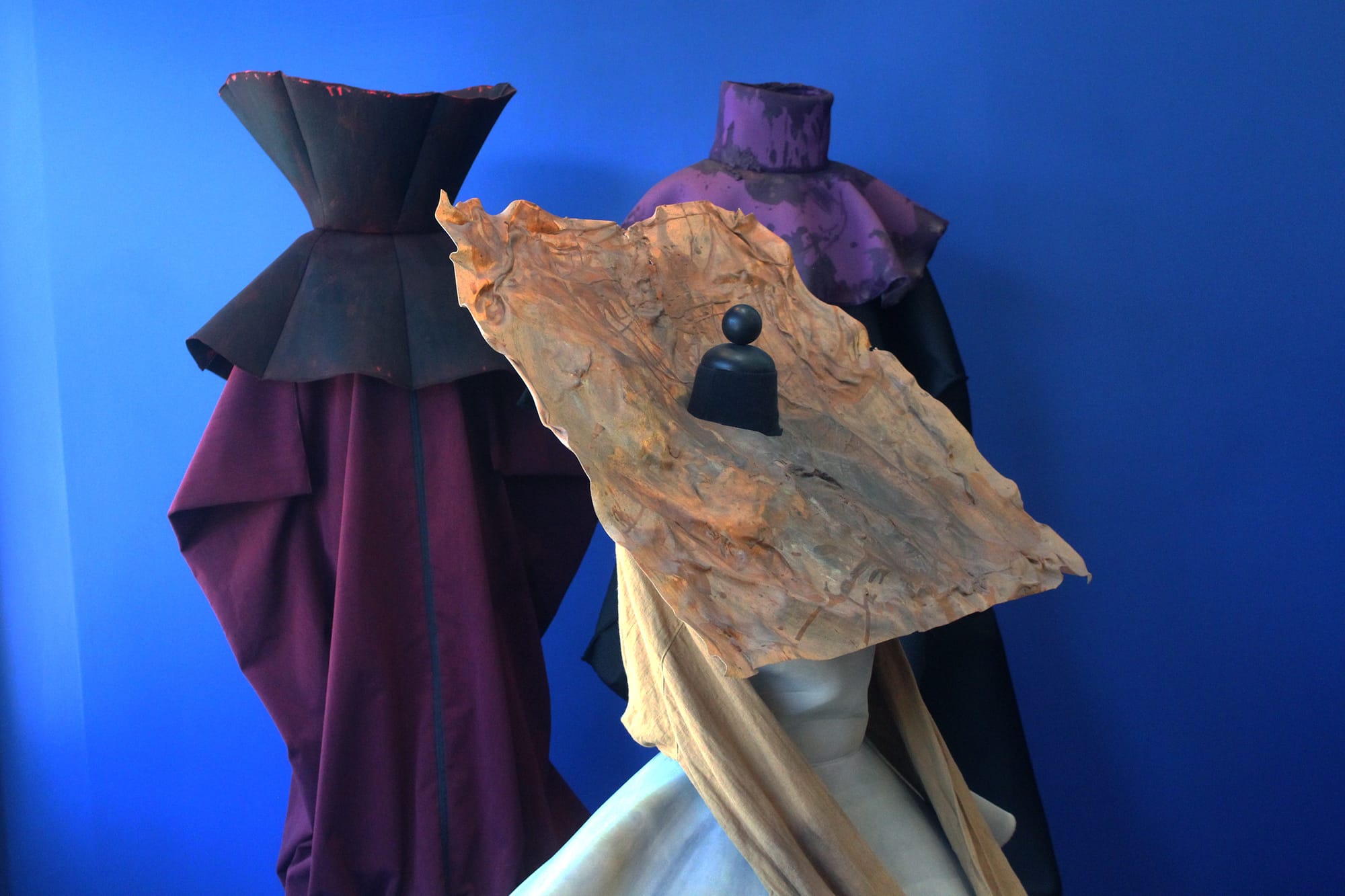 Each piece embodies a character that doesn't exist, but Cooper invites viewers to envision narratives that speak through her silhouettes. In the center, “CANGUE” (2017) could be our protagonist. Her square, crinkled collar gives her a regal stature, diminishing any demureness interpreted by the long mustard sleeves folded in front. Behind her, “Dramatis Personae (Burgundy)” (2018) and “Dramatis Personae (Purple)” (2018) lurk like villains, their heavy robes splattered in paint and beeswax, perhaps stains from battle.