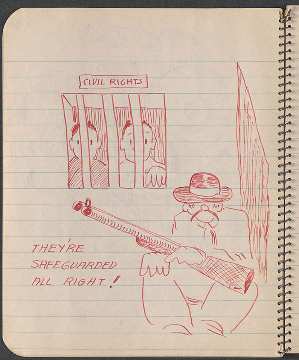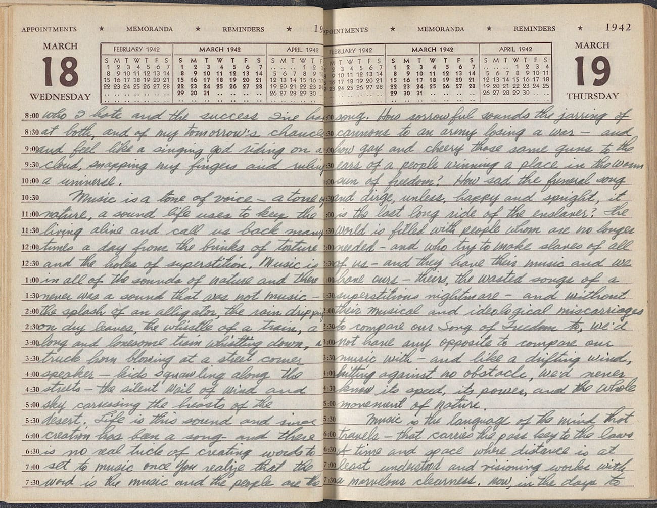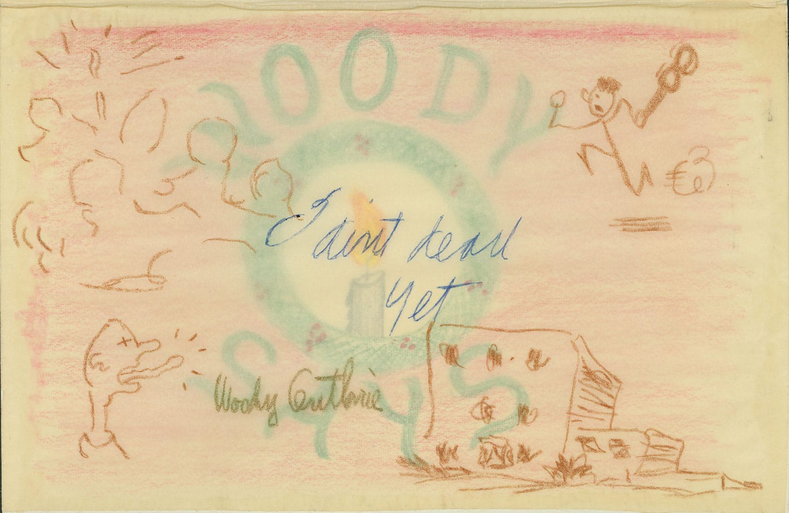 At the Morgan, handwritten and typescript lyrics, single-spaced journals, and image-text paintings, cartoons, and drawings unfurl a relentless autobiographical record that reveals how Guthrie harvested his songbook — 3,000 original compositions, by one count — by attending to the physical and emotional suffering wrought by the daily grind. As he saw it, homegrown greed and its offspring, resentment, produced American brutality and injustice — an insight as true of the United States today as it was in his era.