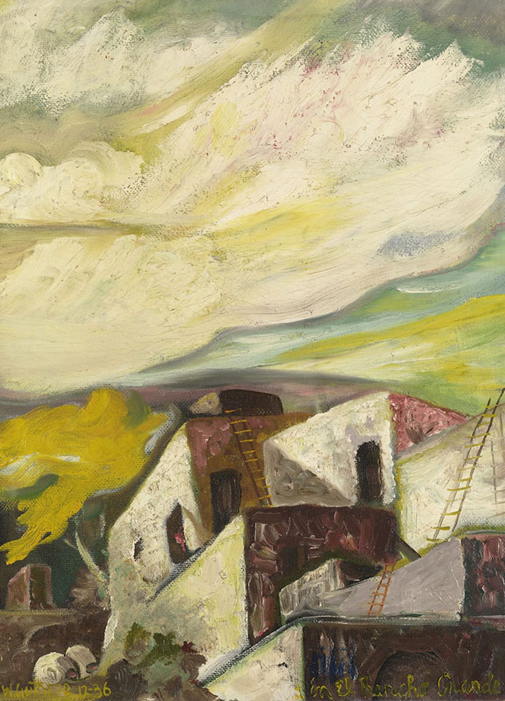 As his music enjoyed national circulation, Guthrie penned Bound for Glory (1943), a poetic autobiography, and House of Earth (1947), a novel that fuses domestic sexuality with New Deal activism as impoverished newlyweds plan a new life by building an adobe home. The milieu is brought to vivid life in a rare Guthrie landscape painting on view at the Morgan.