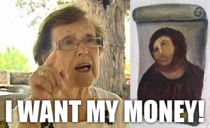Yes, octogenarian Cecilia Gimenez, who destroyed transformed García Martínez’s 19th-century fresco of Jesus into the now infamous Beast Jesus, isn’t pleased that she’s been left out of the spoils of her work. Spanish newspaper El Correo explains that since last Saturday the church has started charging visitors to the site and Gimenez wants some of the €2,000 they’ve raised in four days.