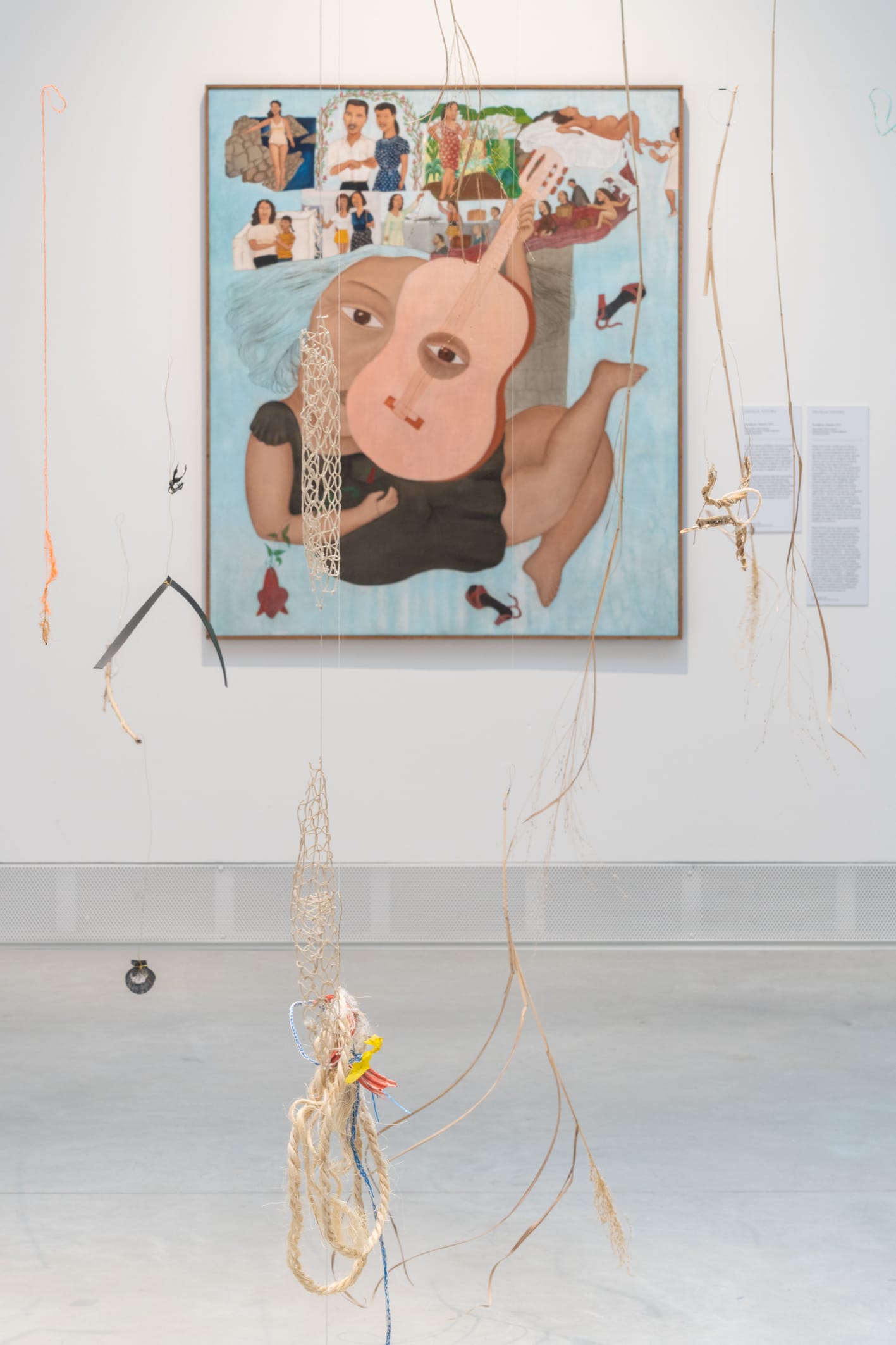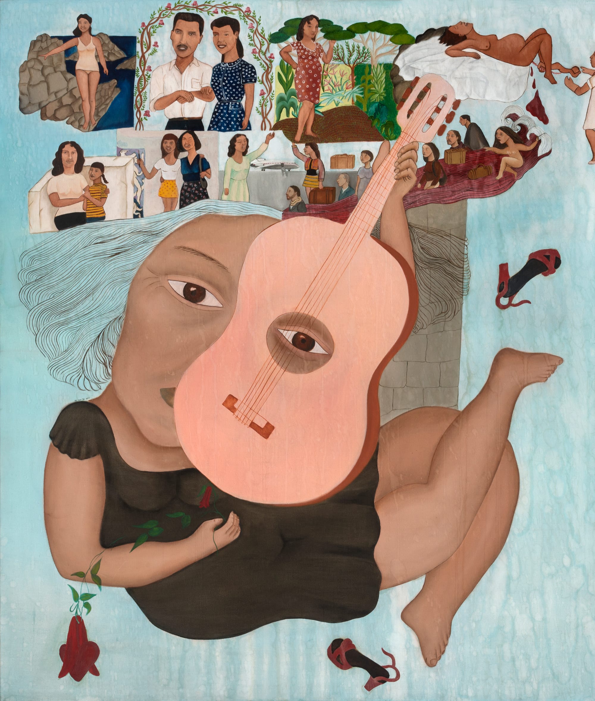 The work portrays Ramírez suspended in a celestial expanse, her face bisected by the sinuous curve of a guitar whose circular chamber exposes one eye. She disencumbers herself of her high-heeled shoes as her locks flow freely. Hovering above, frieze-like vignettes narrate moments from Ramírez's life up until her eldest daughter's departure from Chile on the brink of Augusto Pinochet's 1973 coup, when Vicuña was forced into exile in London; in the painting, the artist drifts away in a rivulet of blood. Years later, the two were reunited in Colombia for the first time since they parted ways, a scene also memorialized in the piece — in another vignette, they are standing side by side, beaming, Vicuña holding a paintbrush.
