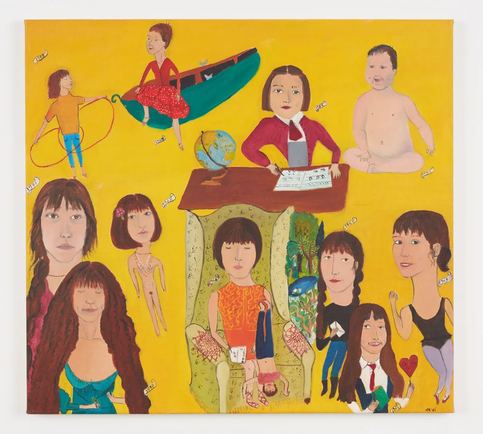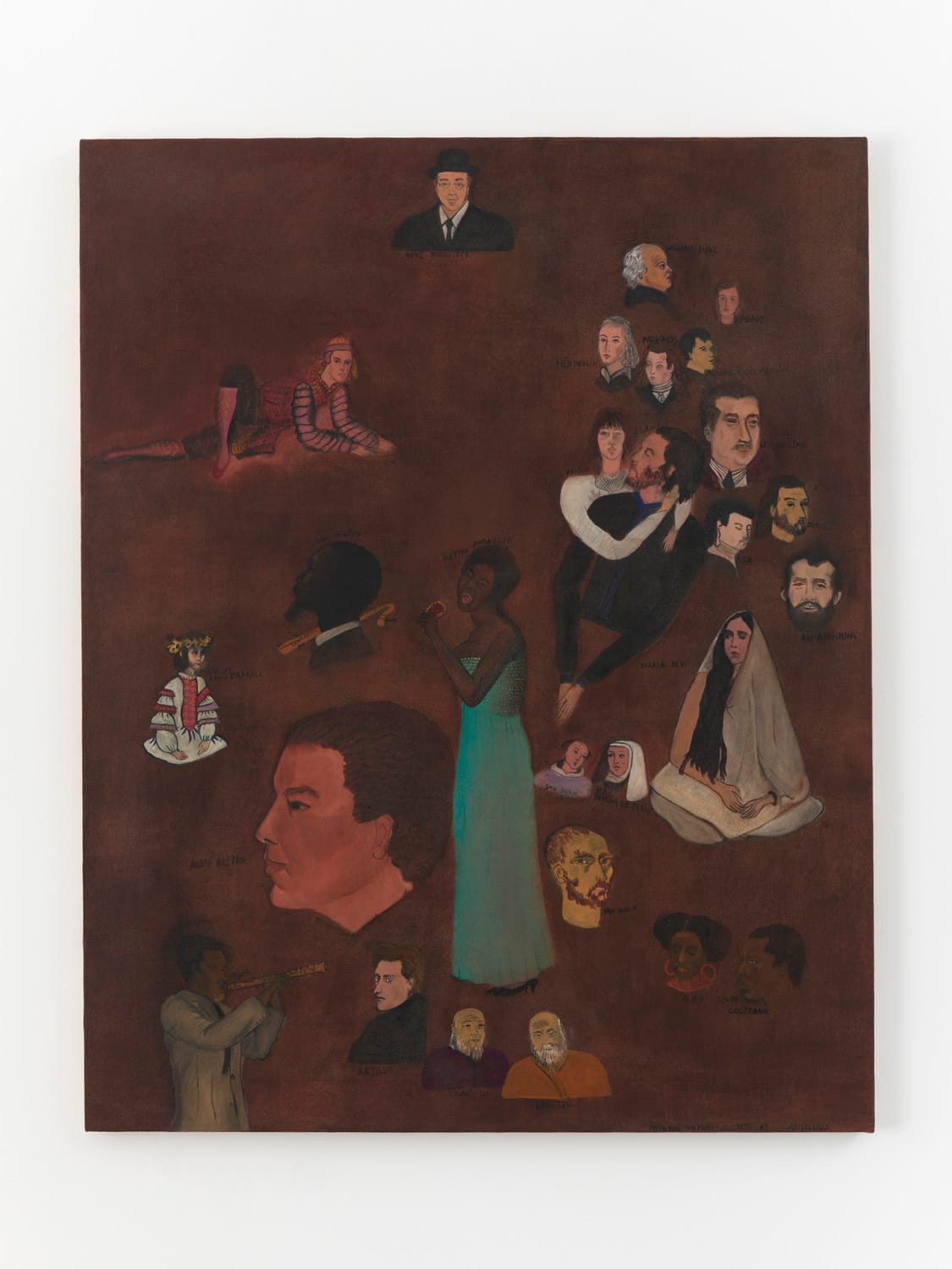 Vicuña’s paintings sound that call with greater affirmation and joy. Most were produced not long before or after the 1973 Chilean coup d'état, an event that marks a sort of pre- and post-lapsarian line in the artist’s biography. Her paintings combine elements of Surrealism, Symbolism, Art Brut, portraiture, and history painting to produce candid parables of personal and political awakening. “Autobiografía (Autobiography)” (1971), for example, depicts her at 10 different ages, from infancy up to the time she composed the painting in her early 20s, engaged in activities that include dancing and falling in love. The self-portraits float atop a saffron background and, with their slightly disproportionate body parts and non-sequential arrangement on the canvas, are unencumbered by normative visual logic without devolving into bizarrerie. “Amados (Loved Ones)” (1969) utilizes a similar compositional scheme — featuring over 20 disembodied heads of religious and artistic figures, from Ramakrishna to William Blake — to create a pantheon of her historical influences at the time.
