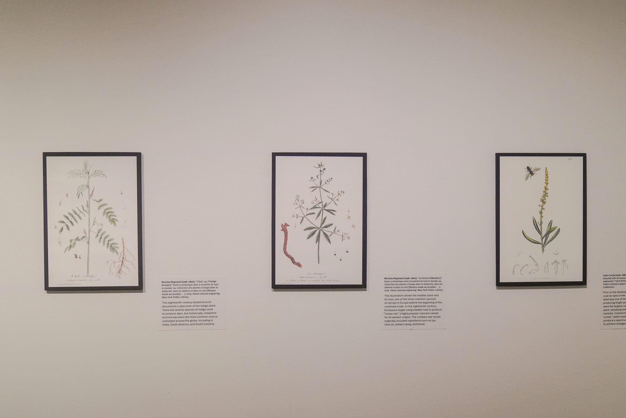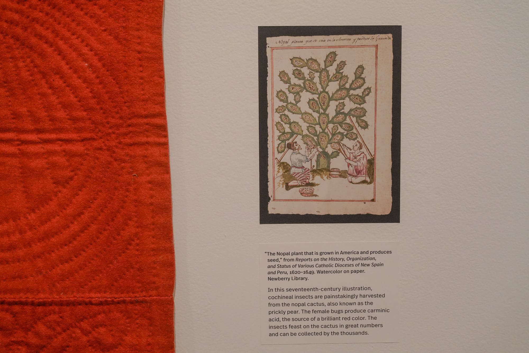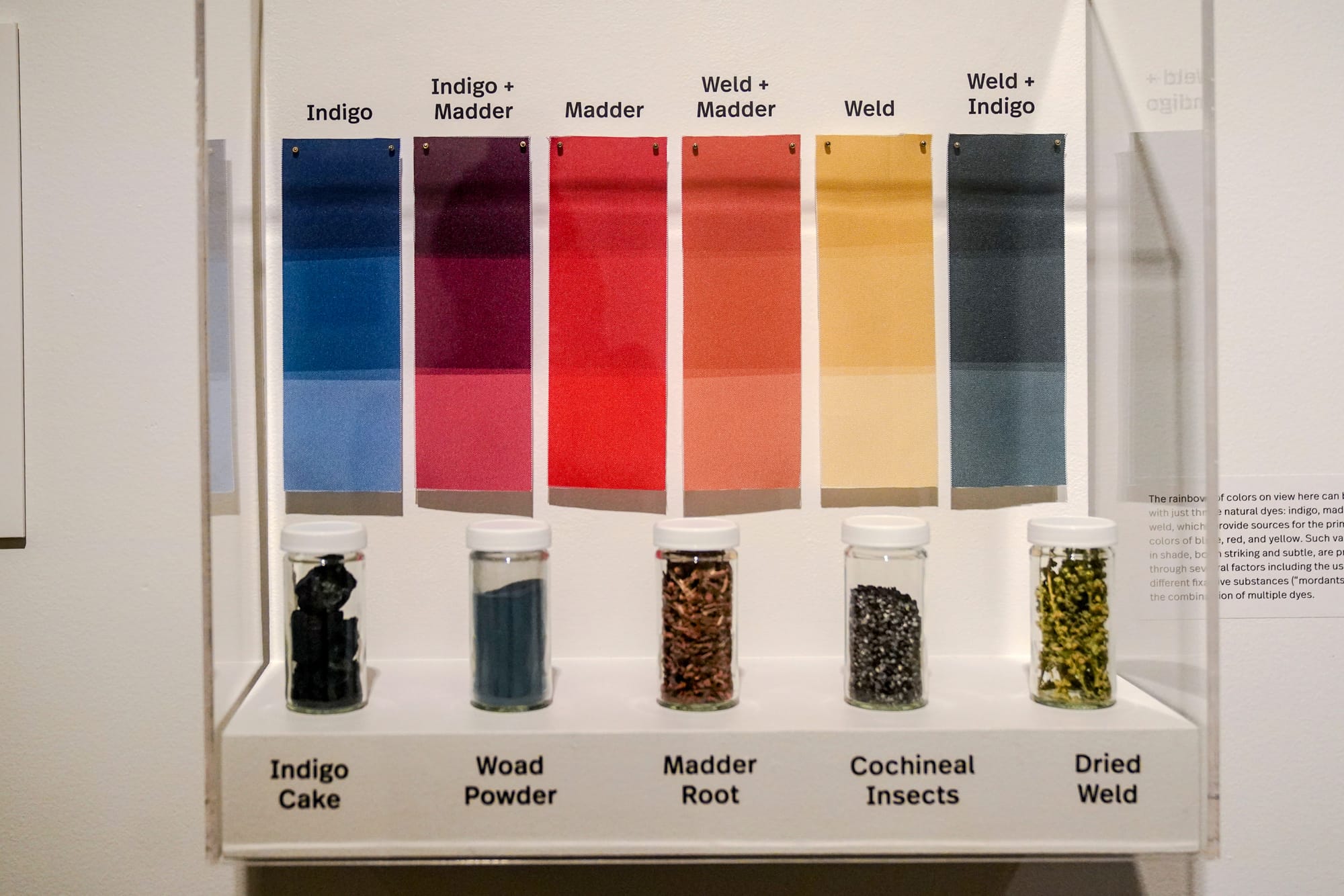 An Ecology of Quilts opens with a trio of whole-cloth quilts: one an all-white field of cotton fabric embellished with patterns of raised dots and florals (“Cornucopia and Dots Whitework Quilt,” c. 1800–1820) contrasted by two brightly colored examples. On the opposite wall, botanical illustrations and vials of common, traditional dyestuffs, including insects (cochineal) and dried plant matter, introduce the fundamentals of natural dye, used to color the two vibrant quilts that start the show. A gradient of fabric swatches highlights the brilliance of the extracted hues: indigo (deep blue), madder root (bright red), and weld (golden yellow). Through an adjoining doorway, a case displays silk cocoons and handfuls of raw wool, linen, and cotton fibers, alongside squares of material woven from each, with an invitation to “please touch.”