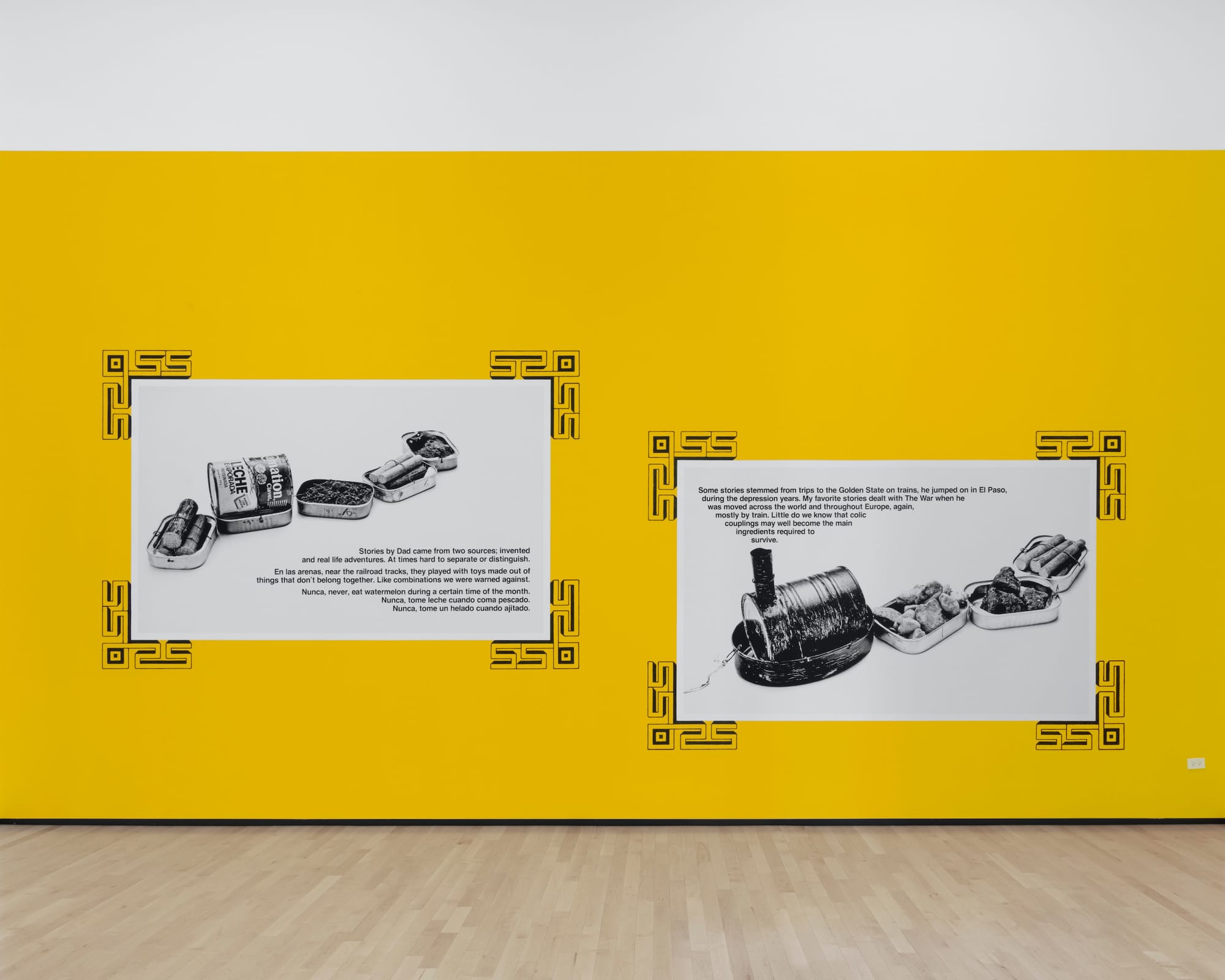With an eye for unearthing cultural hypocrisy and advocating for exploited people, Álvarez Muñoz responds to social injustice, using both direct condemnation and emotional restraint. One such lesson in the latter comes from the installation “El Limite” (1991). She couples large black and white photomurals depicting toy trains made from sardine cans with a text about her father’s life. A traveling train-hopper in his youth, he also spent time on trains in Europe while fighting during World War II, which the artist ties to the Mexican Revolution and the Bracero Program of the 1940s by including smaller documentary photographs from that time.