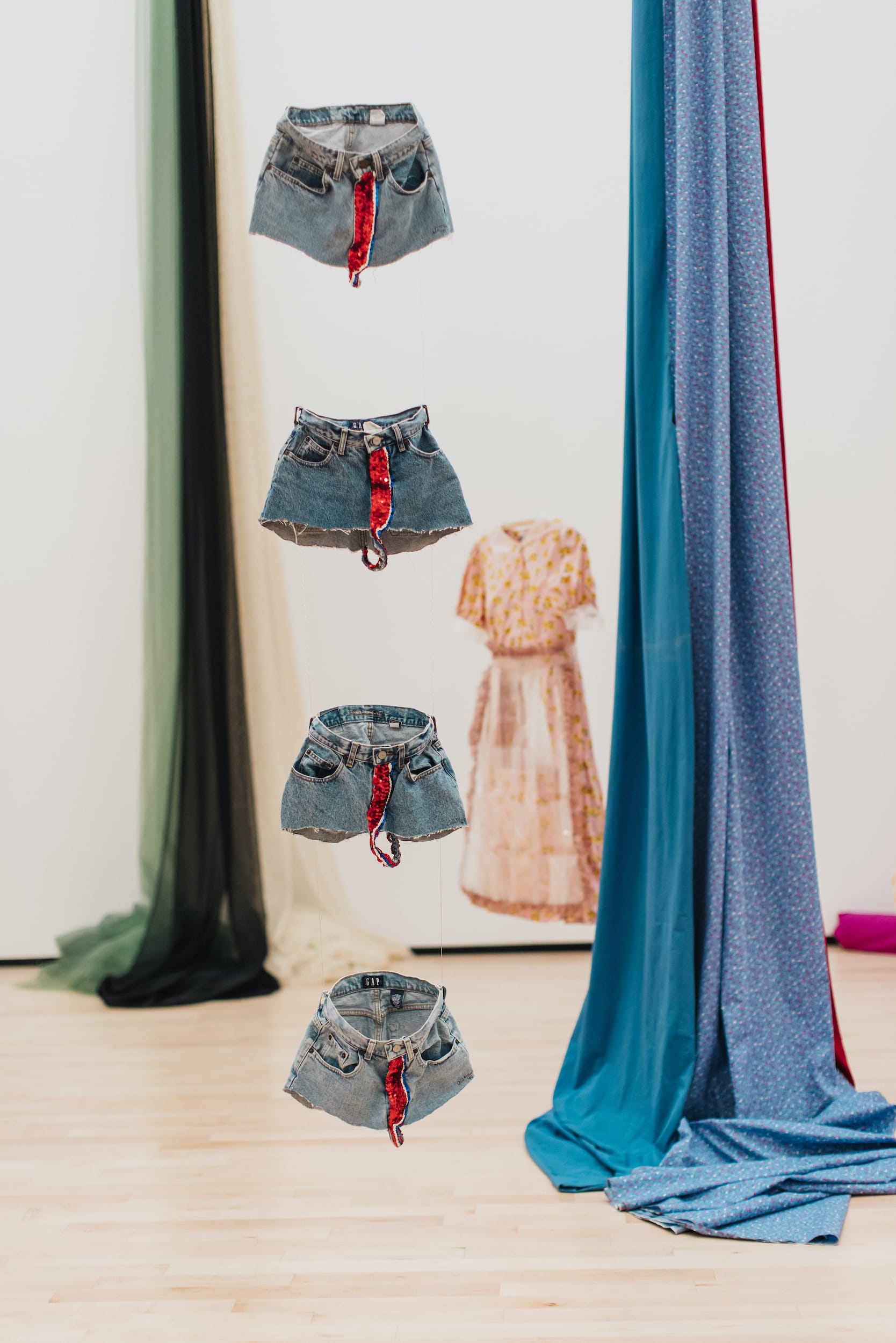 In “Fibra y Furia” (1997), Álvarez Muñoz addresses labor abuses yet again, this time with a focus on gender discrimination. Large swathes of fabric hanging dramatically from the high museum ceilings are paired with stereotypical housewife dresses. This visually compelling piece comments on the fashion industry’s exploitation of female labor to make garments that ironically hold women captive in their gendered identities. “Fresas” (1997) likewise exposes the sexualization of women in society. Denim “booty” shorts are cut into a thong in which the crotch is tellingly replaced with red sequined fabric, connecting objectification to the way female labor in the garment industry is undervalued.