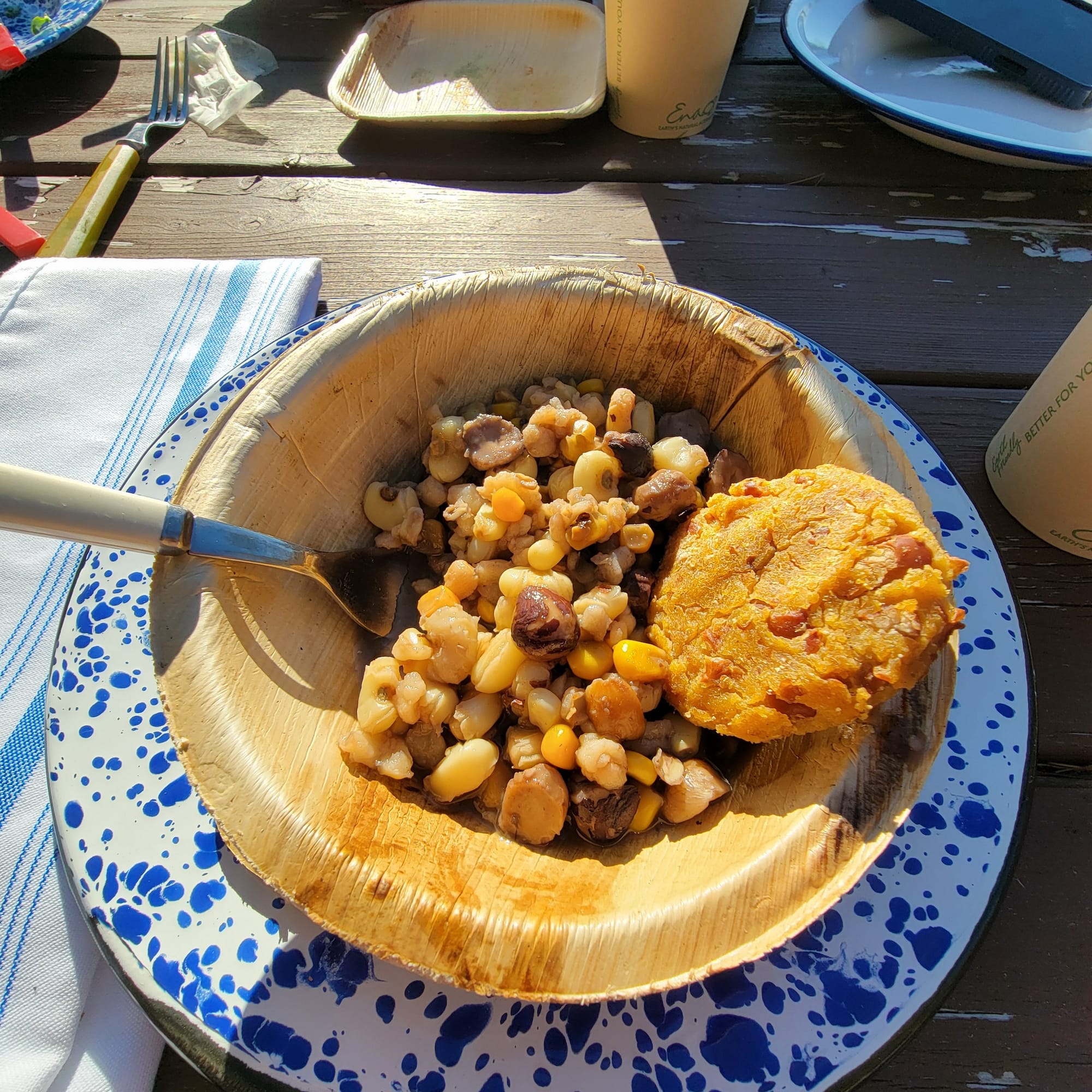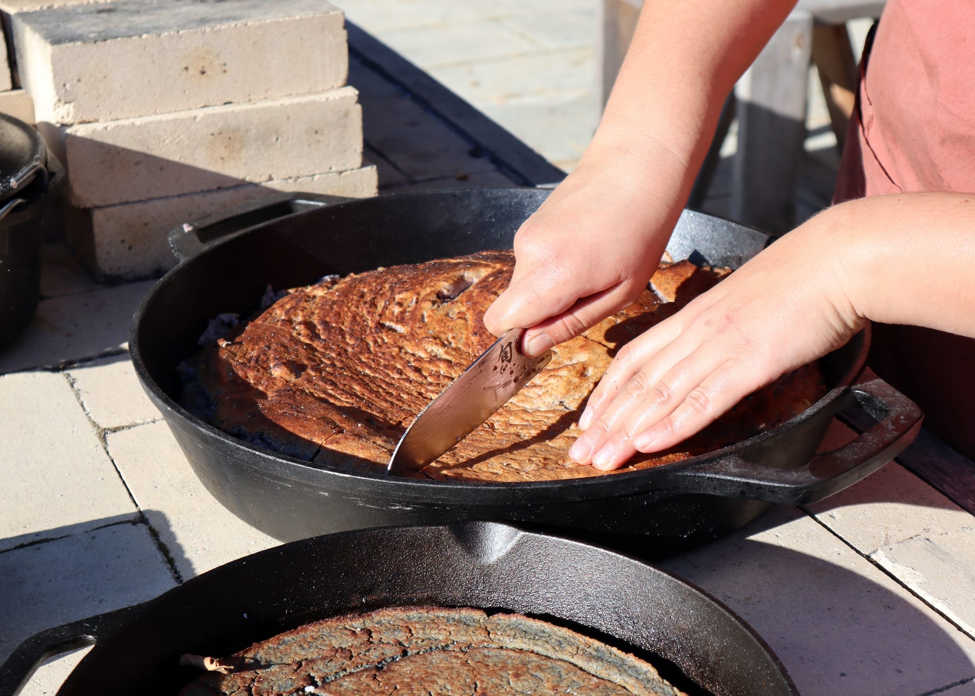 Hosted in an outdoor kitchen, visitors had the opportunity to witness the dance between the chefs cooking in tandem, the fire oven blazing, smoke and steam wafting in the breeze, and the hands-on Forge staff rolling up their sleeves to support everything from food prep to plating. As each course of the meal was served, Chef Barton presented the gastronomy of the traditional Southeastern dishes, narrating Native stories relating to the ingredients and demonstrating how storytelling can provide a deeper understanding of the plants, animals, and people that contributed to the creation of the shared meal.