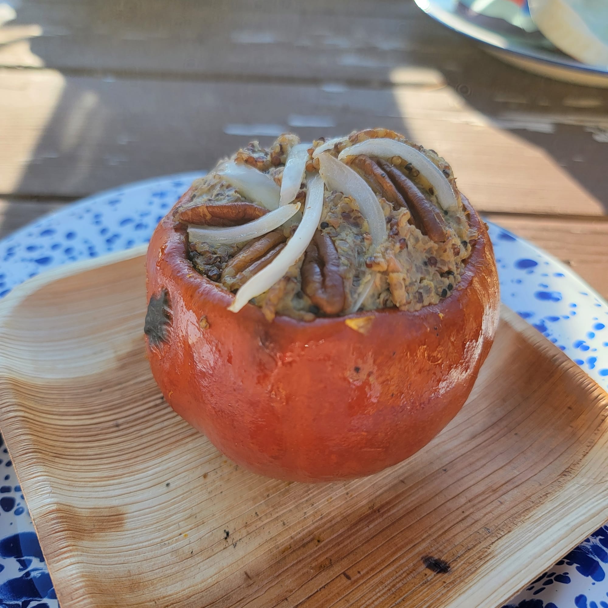 Reed and Barton have been collaborating on meals since 2018 and wanted their menu to be a celebration of their Choctaw and Cherokee cultures. Courses this weekend included Tanchi Labona stew, fried wishi mushrooms, venison, Plum Bayou Casserole served in miniature pumpkins, catfish, bean bread wrapped in Oak and Hickory leaves, Kanuchi (a type of Cherokee pureed nut soup), and grape dumplings, just to name a few.
