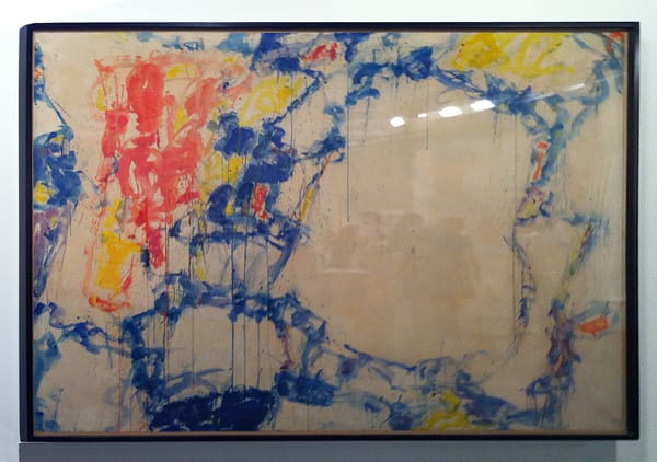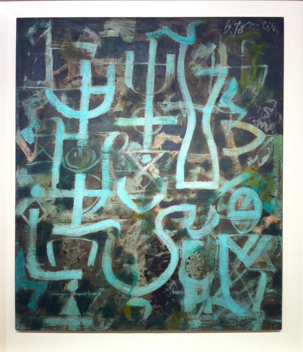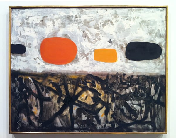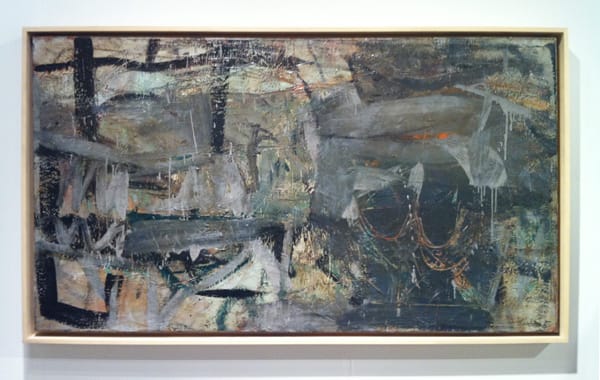 Jean-Paul Riopelle (1923-2002), "Ombre d’Espace" (1954), oil on canvas, 51 ¼ x 77 ¼ inches. Riopelle was Canada's great hope for a voice in mid-century art. Riopelle began a relationship with the American painter Joan Mitchell in 1959. Living together throughout the 1960s, they kept separate homes and studios near Giverny, where Monet had lived.Bradley Walker Tomlin (1899-1955), "Moonlight" (1949), oil on canvas, 48 x 44 inches. Bradley was one of the earliest of the Abstract Expressionists. According to Whitney curator John Baur: "Tomlin’s life and his work were marked by a persistent, restless striving toward perfection, in a truly classical sense of the word, towards that “inner logic” of form which would produce a total harmony, an unalterable rightness, a sense of miraculous completion … It was only during the last five years of his life that the goal was fully reached, and his art flowered with a sure strength and authority." This quote could easily be applied to Soutine."