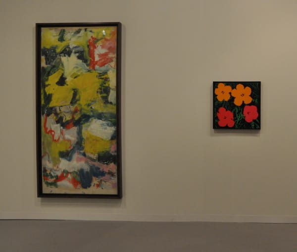 Willem de Kooning, "Untitled" (1977), oil on paper on canvas hangs next to a Warhol "Flower" at Gagosian. Warhol's Flowers were based on a color photograph of hisbiscus blossoms taken by Patricia Caulfield which appeared in the June 1964 issue of Modern Photography magazine. The reprinted still life perhaps has more in common with Soutine than we'd like to accept. (photo by Hrag Vartanian/Hyperallergic)