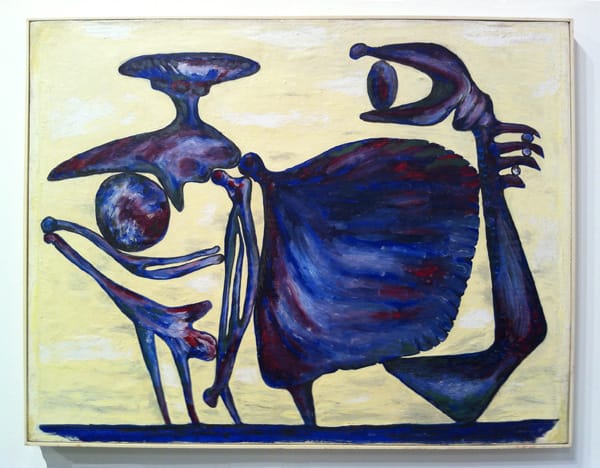 David Smith (1906-1965), "Untitled (two bony figures)" (1946), oil on paperboard, 23 ¼ x 30 inches. The painting is terrific example of Smith biomorphic compositions. Even in this painting one can feel the weight and monumentality so present in his sculptures.