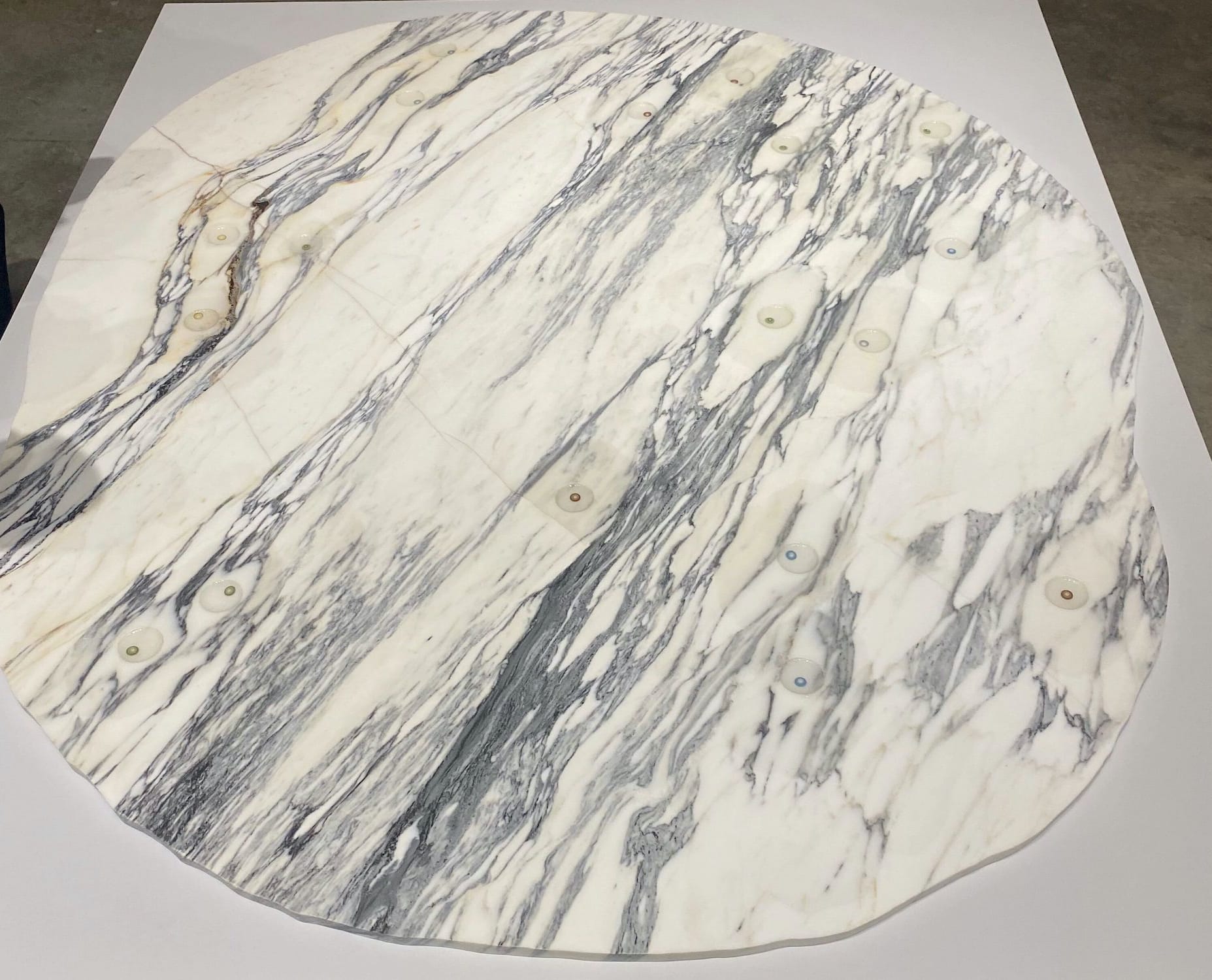 Activation and encounter are crucial to Pérez Córdova’s practice. “You, Me, Us, You, Them” (2022), for example, consists of a large, flat circle of marble. Subtle indentations in the surface hold individual, color contact lenses suspended in liquid. The work is activated by chance encounters with people in the space wearing matching-colored contacts, in a performative moment. Similarly, “Portrait of an Unknown Person Passing By” (2019), a ceramic vase decorated with a floral pattern, is in dialogue with a person wearing a dress with the same design, whom visitors may or may not notice. The participants in these activations are subtle and unannounced; viewers will see them only by chance. With these works, Pérez Córdova nods to the potential that objects and materials hold to stir a memory or spark a connection.