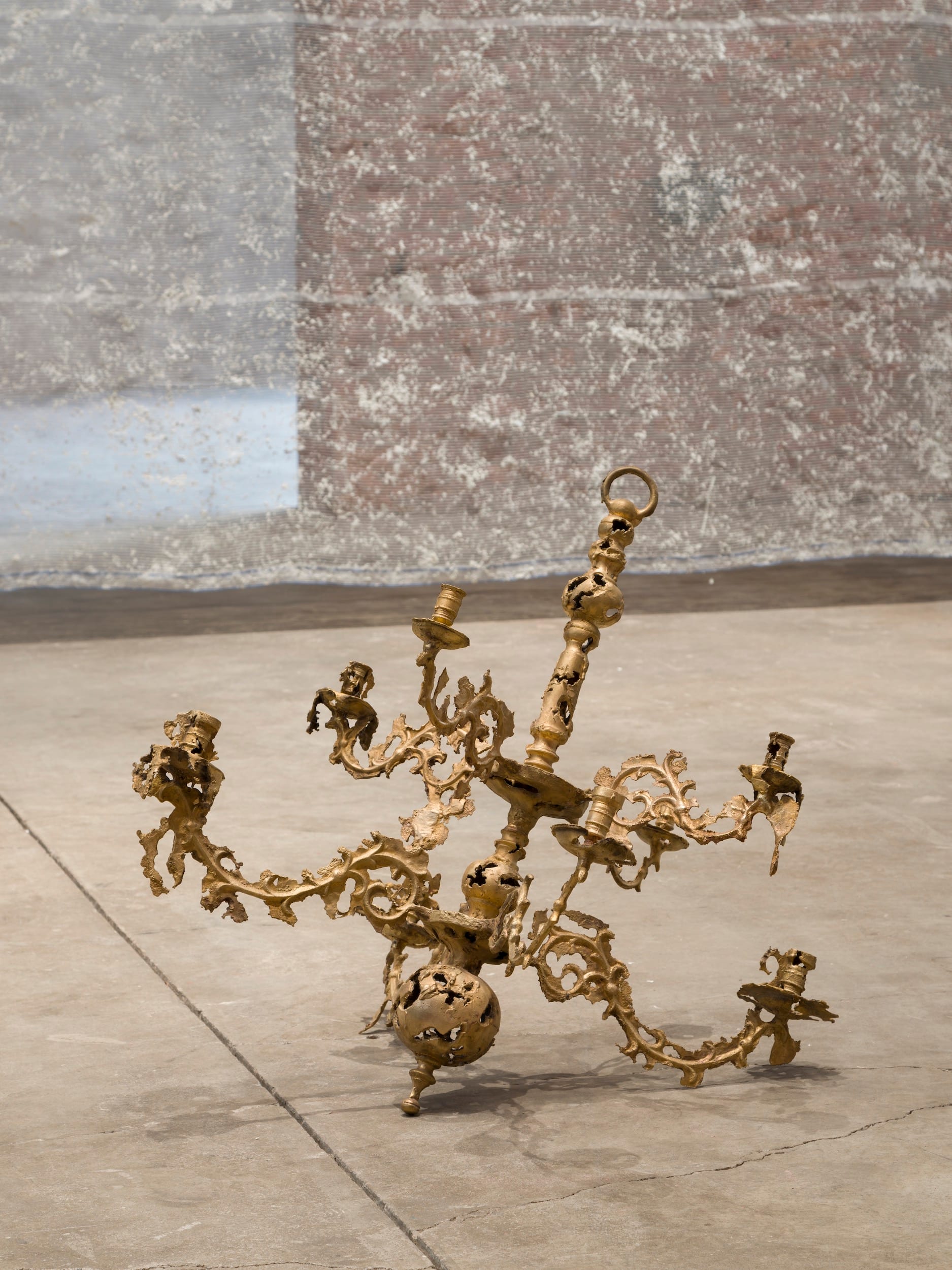 Tania Pérez Córdova: Generalization at SculptureCenter spans a decade of the Mexican artist’s career. Her first solo institutional survey in the United States, it illustrates Pérez Córdova’s interest in materiality, the gaze, the passage of time, negative space, and the shortfalls of discourse. Elegantly displayed across the spartan, industrial interior of SculptureCenter, the exhibition brings together sculptural bodies of work she is known for, such as large artificial leaves punctuated by delicate gold chains that recall glistening streams of rain, as well as new pieces made specifically for the show. The latter group includes an architectural intervention entitled “Name, Phone, Email, Postcode” (2023), a diaphanous veil made of anti-hail mesh (netting to protect crops) and industrially destroyed confidential documents draped across the gallery entrance.