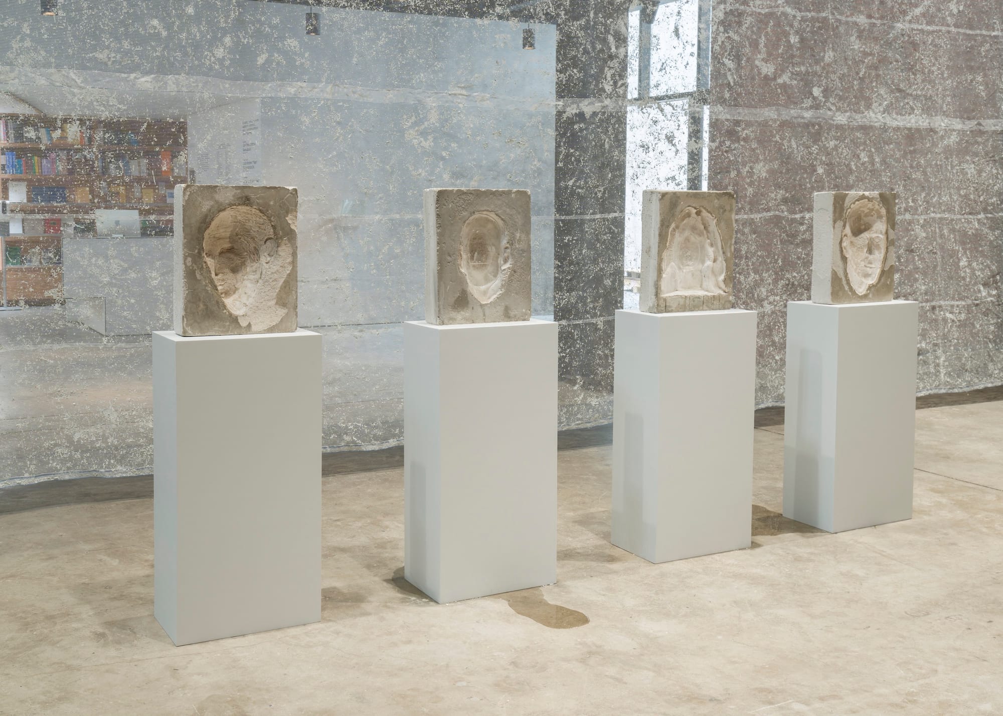 The artist also explores negative space and time, often by employing the physical qualities of water. In “All Our Explanations” (2022), she sourced 3-D models of human heads from an anonymous online bank to create concrete molds. Each mold is filled with water and frozen daily so that the ice slowly melts down the plinth. Eventually, an empty cavern of the mind is revealed, symbolizing the many thought processes that take form in one’s head.