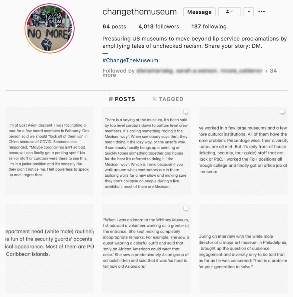 @ChangeTheMuseum is posting "stories of unchecked racism" that speak to the discriminatory practices plaguing cultural institutions.