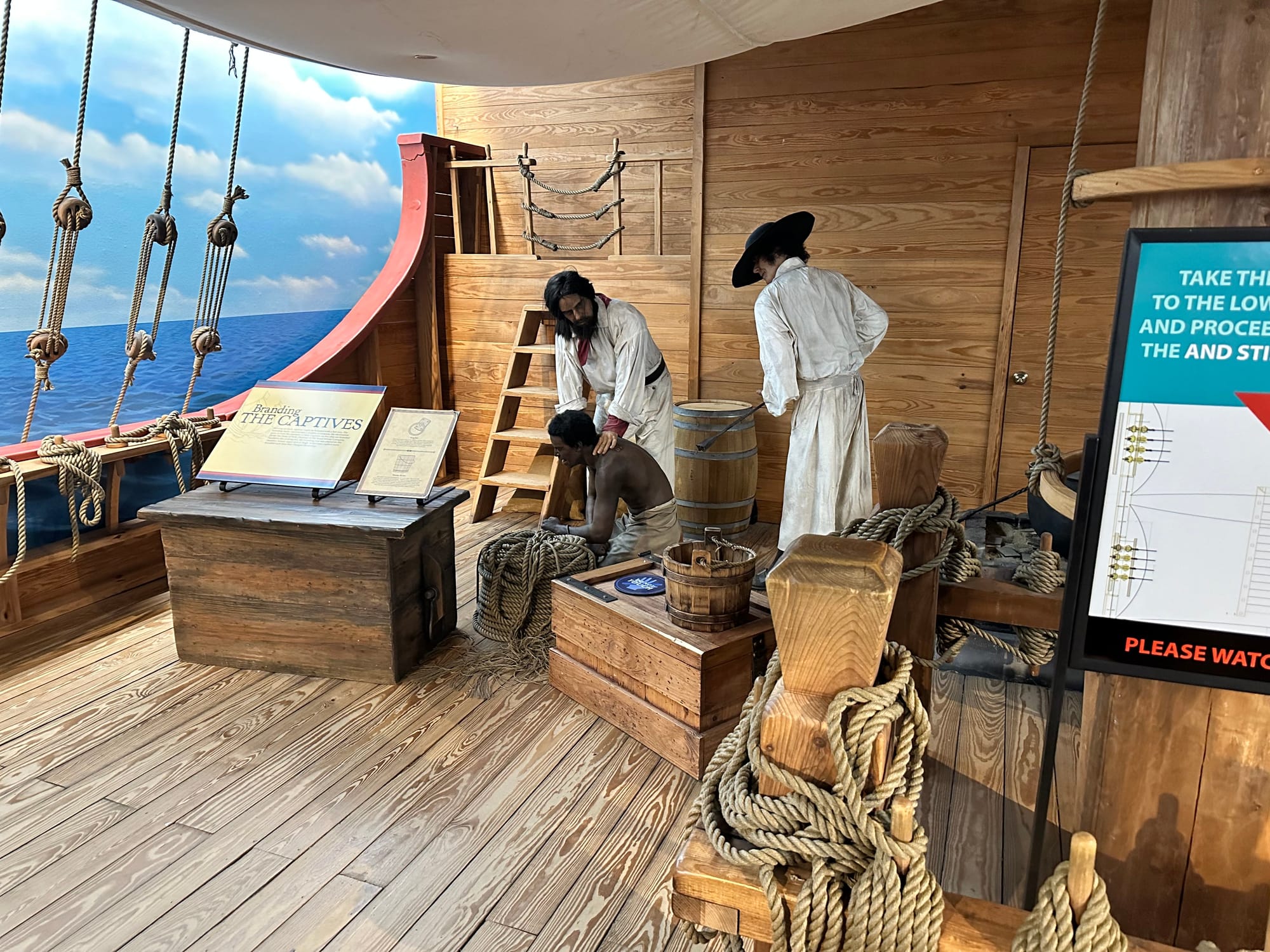 This installation is humanity’s origin story. It begins on the African continent. Ranging from modern-day Morocco to South Africa, it includes illustrations of the ecology, geological landscape, and the various political contexts. Here, the exhibit argues that every member of the Homo sapiens species is descended from a genealogical “Eve” who existed in prehistorical Africa. The journey continues, outlining the development of major African civilizations (with particular attention paid to the kingdom of Benin, a highly organized city-state from the 13th through the 19th century), as well as encounters with people from other parts of world, the evolution of diverse economies, and the onset of the transatlantic slave trade, where the story takes a decisive turn.