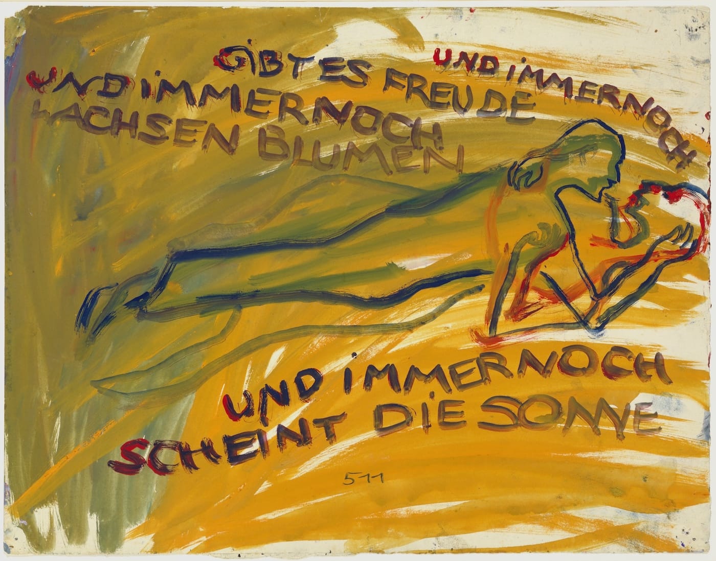 Charlotte’s roles throughout are multiple. She is the narrator, the commentator, the exhumer who forces herself to dig out the often painful truth beneath the veneer of normality and respectability. The terrible stain of Hitler, who came to power in 1933, when Charlotte was 15 years old, is always just beneath the skip and the skin and the meander of the later part of the story. She called it a play with music because she cites many musical references within individual paintings, as if expecting a sympathetic tune to leap out of the silence of our absorbed looking. “Since I myself needed a year to discover the significance of this strange work,” she wrote, “many of the texts and tunes, particularly in the first paintings, elude my memory and must – like the creation as a whole so it seems to me – remain shrouded in darkness…”