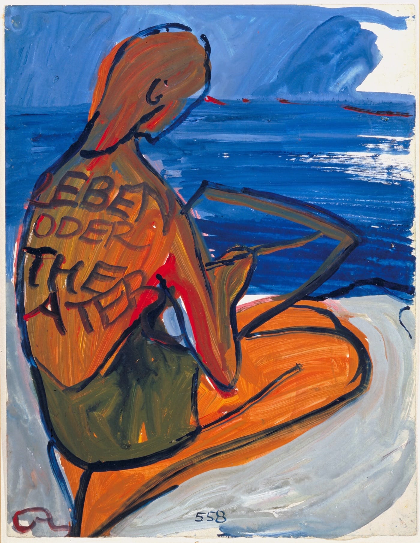 What we see on the walls of the Jewish Museum on a quiet Victorian side street in the raucously crowded, teen-beguiling, razzmatazz district of Camden, North London, is about one-third of the small paintings, all of a regular size, that formed part of a huge project called Life? Or Theatre?, which would eventually consist of more than 750 individual works on paper.