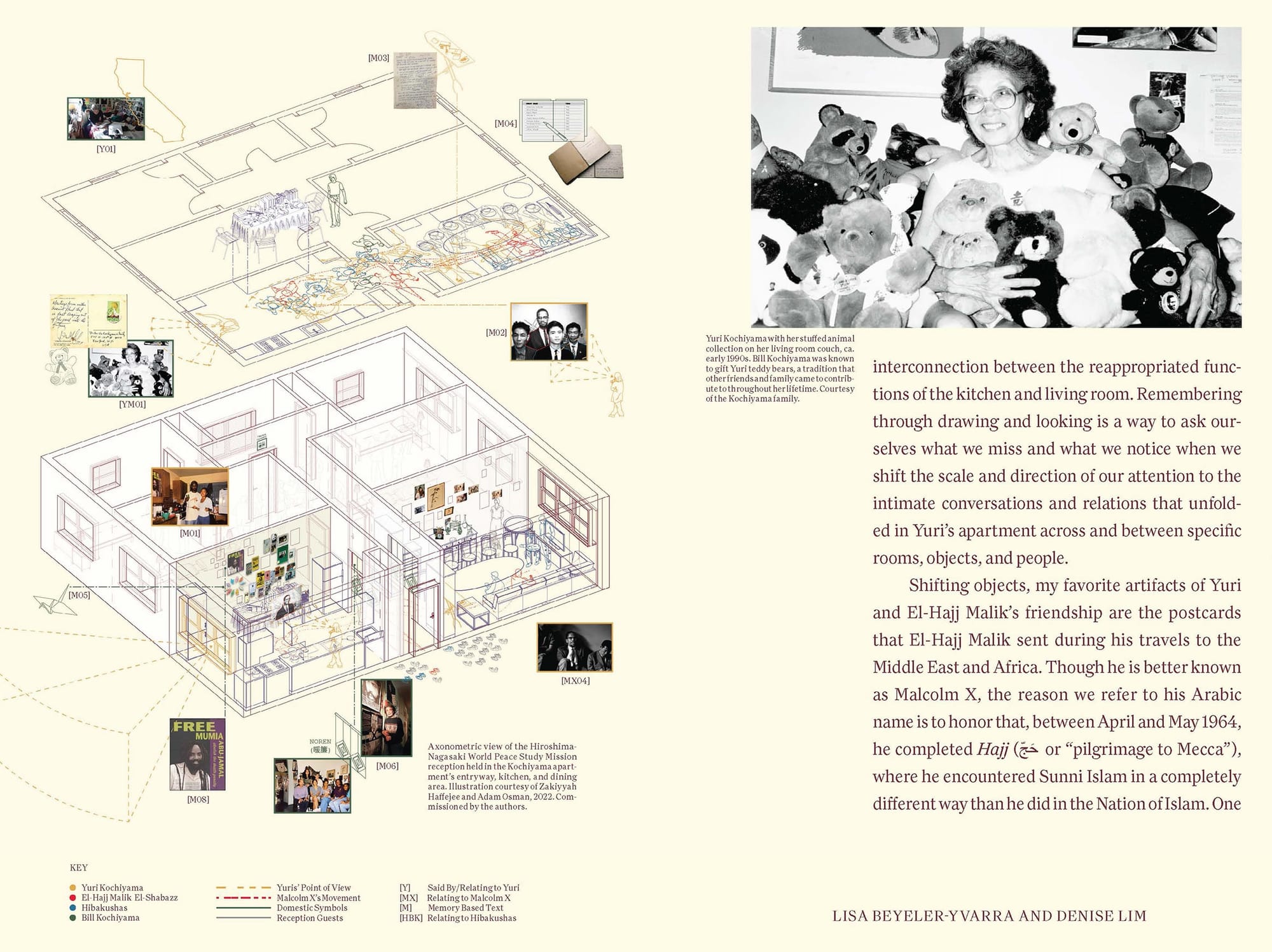 Elsewhere in the book, a transcript of a conversation between scholars Lisa Beyeler-Yvarra and Denise Lim underscores the interracial solidarity between Malcolm X and Japanese-American activist Yuri Kochiyama, whose granddaughter Akemi Kochiyama is another featured contributor. Archival images of Kochiyama in her Manhattanville projects apartment, which is decorated with protest ephemera and was a site of abolitionist meetings of which Malcolm X was a part, have been remodeled by Zakiyyah Haffejee and Adam Osman as a 3D diagram to emphasize how the space also functioned as a library and community center. In the moments we see his comrades shine, we remember that the sun doesn’t rise and set on Malcolm X alone.