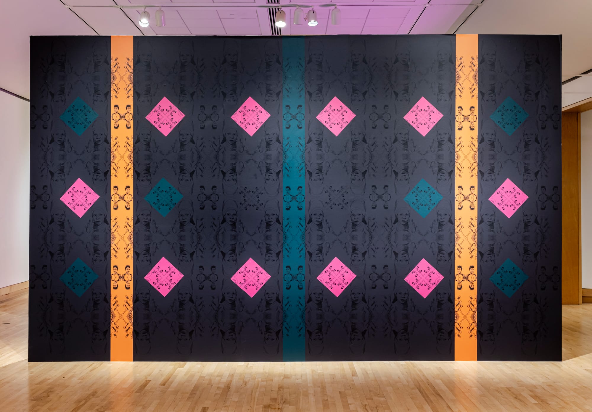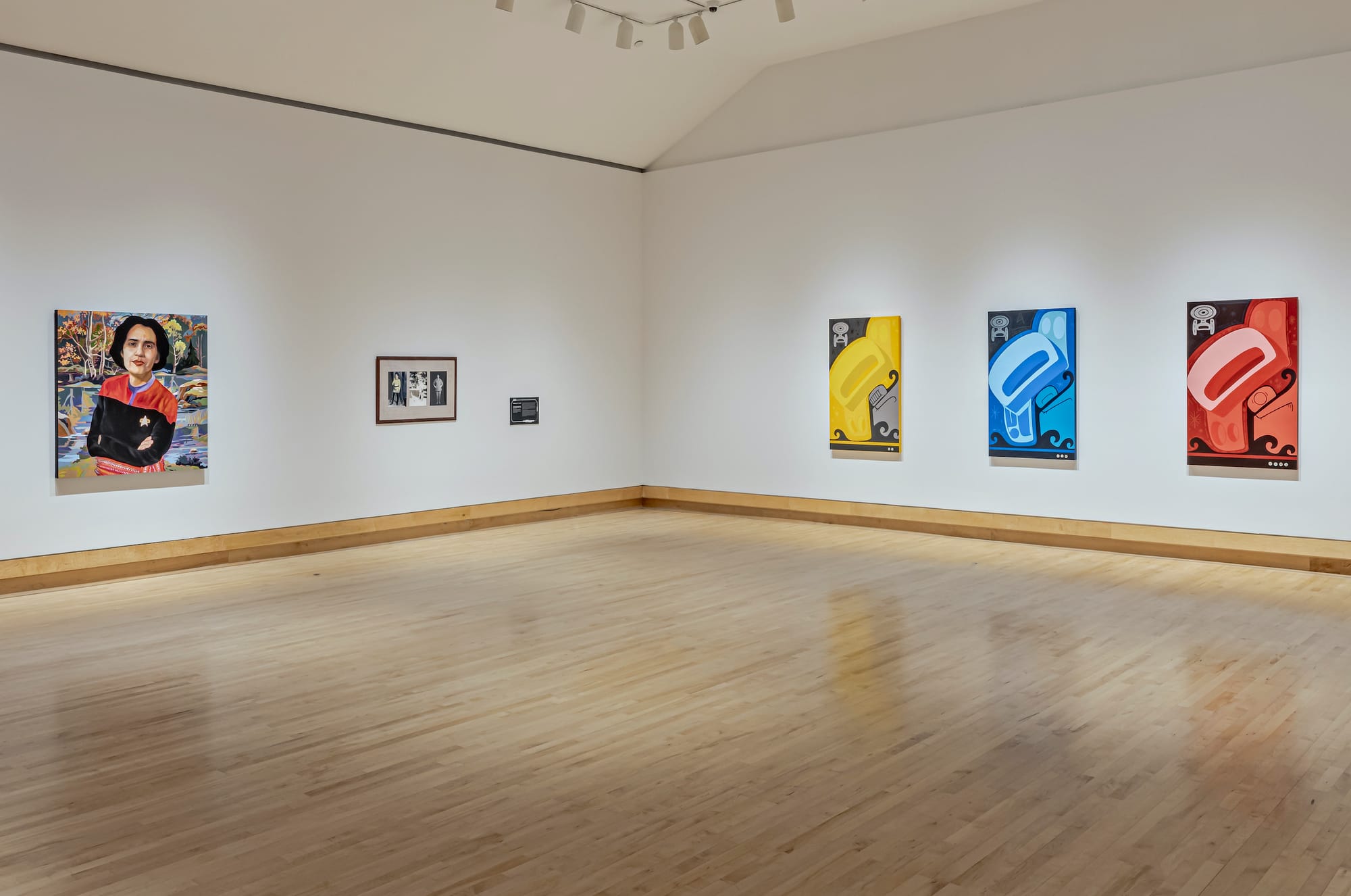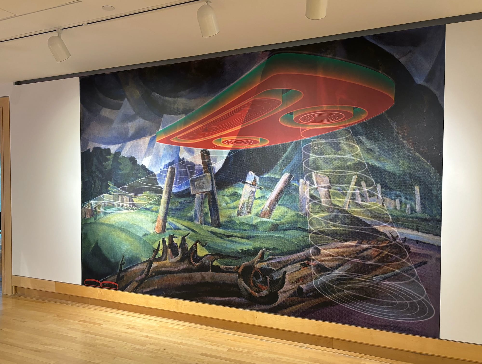 This jarring incongruity is established upon entering the first gallery space. To the left, a black-painted title wall mimics the cyan-blue-hued digital displays of Star Trek: The Next Generation’s Enterprise starboard consoles. On the opposite wall, Sonny Assu’s (Ligwiłda'xw of the Kwakwaka'wakw Nations) large-scale vinyl print depicts a futurist Northwest Coast-style spaceship flying high above an abandoned forest village site with dilapidated totem poles.