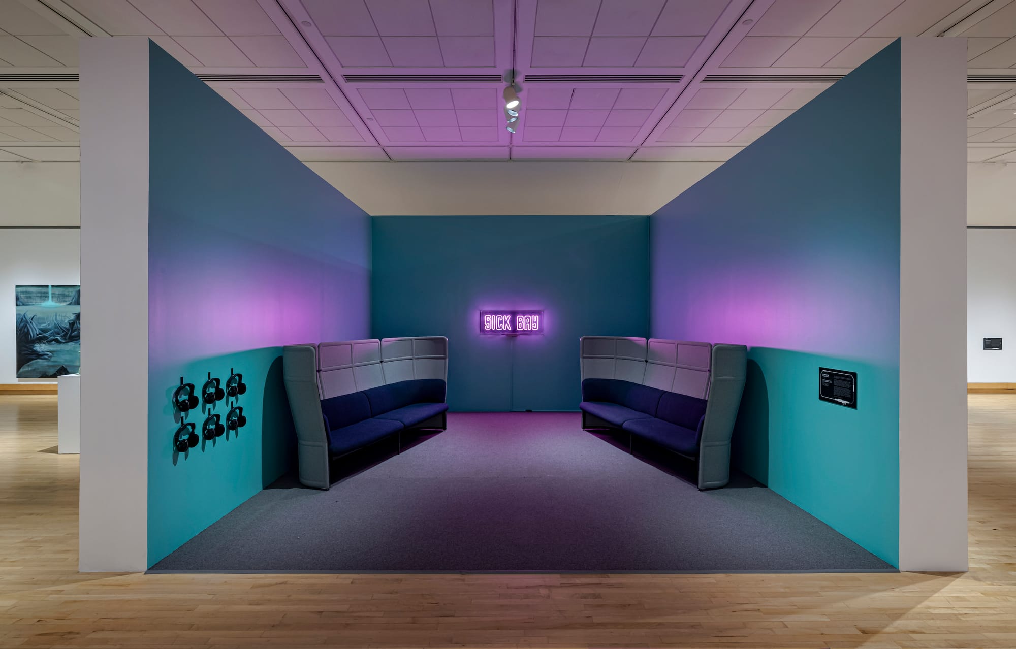While the outer space conjured in To go boldly feels vast, many works are wall-mounted, resulting in an expanse of wooden floors and empty white wall spaces that make the show appear sparse in its floor plan. Granted, many of the pieces were commissioned and accompanied by dense didactic text on shiny, Enterprise-console-mimicking labels. But as a writer and curator who researches fandom collaborative processes, I yearned for more tangible interpretive displays of fannish material culture — even a vitrine with fan zines and other Trekkie fan works would have been fine.