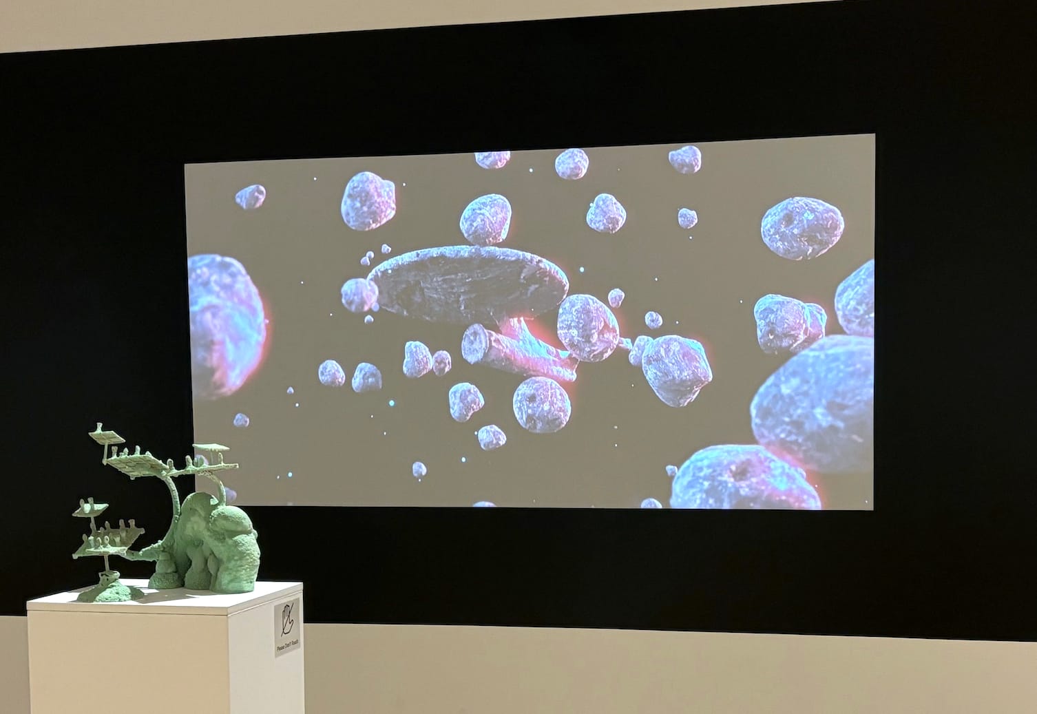 To its credit, the show includes strong works. Australian-Canadian artist Dara Gellman’s three-minute single-channel video, “Alien Kisses” (1998), reclaims a scene from a 1995 Star Trek: Deep Space Nine episode in which two women kiss. The video engages in many strategies typical of “vidding,” a fannish form of remix practice that creates music videos from found video sources. There’s the incremental, slow-burn pacing, a pixellated blue quality (likely due to copying footage from one VCR tape to another), a sensuous mid-tempo techno soundtrack, and a femslash gaze to revel in. Canadian artist Alex McLeod’s commissioned “Space Fossil” animation and “Chess Growth” 3D-printed chess set tackle the fanfiction “canon divergence” concept, imagining a Star Trek: The Next Generation “What If?” scenario where the Enterprise crew ignore warnings about warp drive’s harm on subspace life. (See the 1993 “Force of Nature” episode.) Featuring a fossilized Enterprise floating on an asteroid field, the works comment on climate change, but they could also be a comment on how toxic beliefs — for example, racist and sexist backlashes against diverse characters in a large sci-fi/fantasy fandom like Star Wars — can take hold in a fandom's universe and not let go.