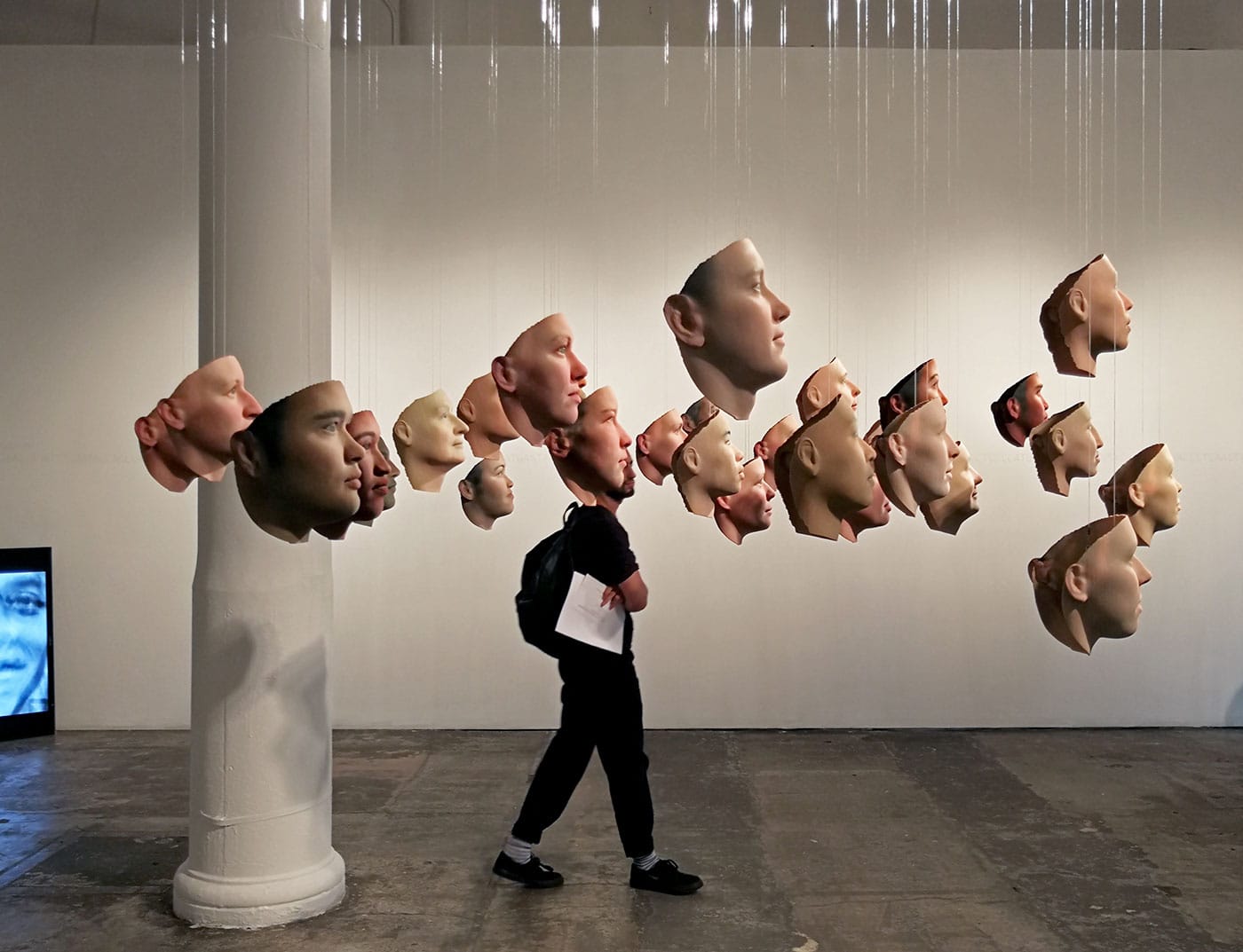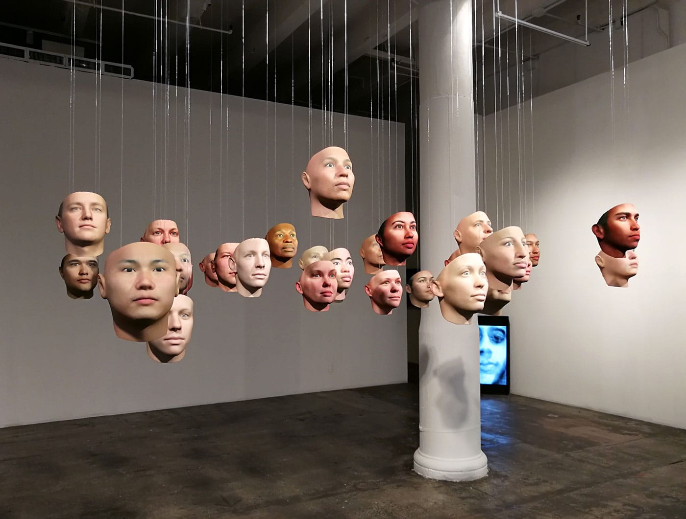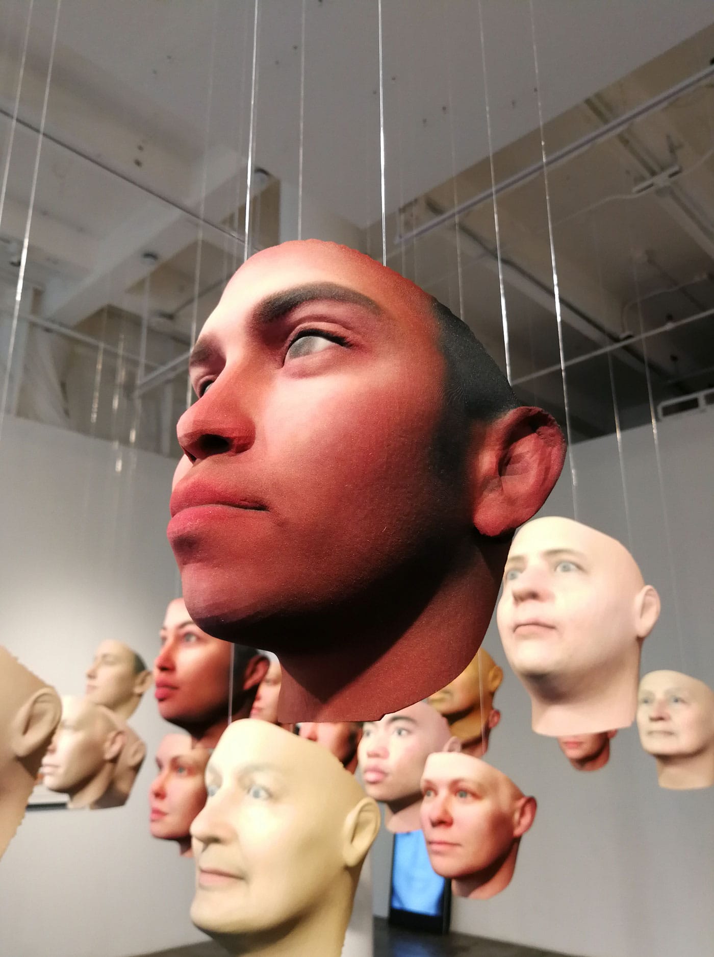 Walking in, the viewer is confronted by a sea of realistically rendered 3D portraits. Suspended in mid-air, 30 mask-like faces meet the viewer at eye level, constituting a wave of varying skin colors, facial features, and expressions. The installation, entitled “Probably Chelsea” (2017) is a continuation of the concepts and processes that informed Dewey-Hagborg’s previous work: using a sophisticated, powder-based 3D-printing technology, she produced portraits of strangers from bodily scraps she picked up in public spaces. Whereas those were renderings of people she didn’t know, here the work has sprung from an intimate relationship based on trust and mutual understanding that she and Manning have forged since 2015. From prison, Manning mailed cheek swabs and hair clippings to Dewey-Hagborg, who extracted DNA information from them and used it to algorithmically generate possible portraits of her friend.