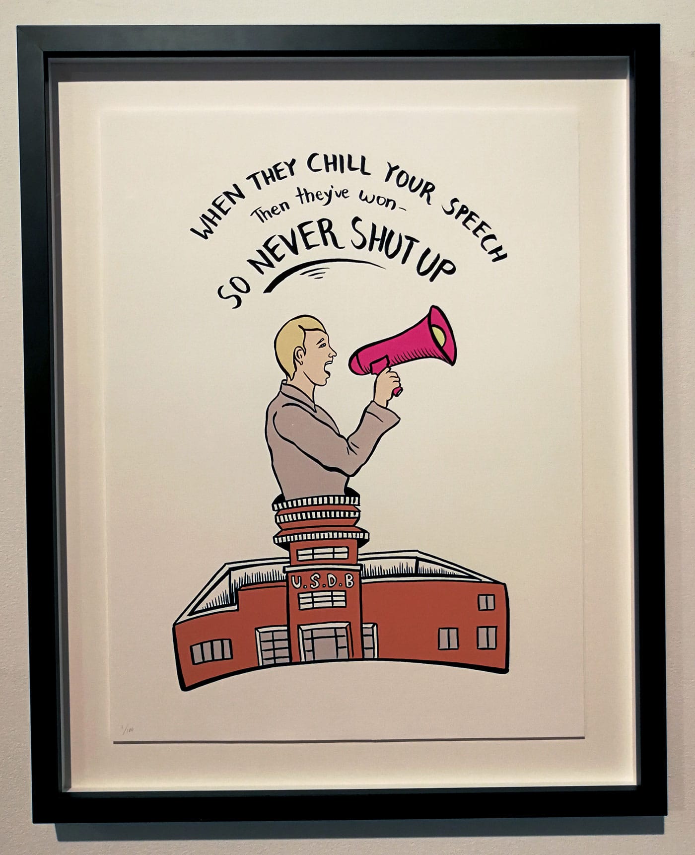 The duo also collaborated on Suppressed Images (2017), a comic book illustrated by Sholi Kanungo and on display at the gallery. One panel shows Manning bursting out of a prison complex with a loud speaker, saying, “When they chill your speech, then they’ve won. SO NEVER SHUT UP.” If prison strips incarcerated people of their humanity by denying them their image and the representation of language (among other things), Dewey-Hagborg’s work — especially the faces in “Probably Chelsea” — has helped rekindle Manning’s visibility, particularly when she was still behind bars. It also represents a clear act of solidarity with the famed whistleblower and proud trans woman.